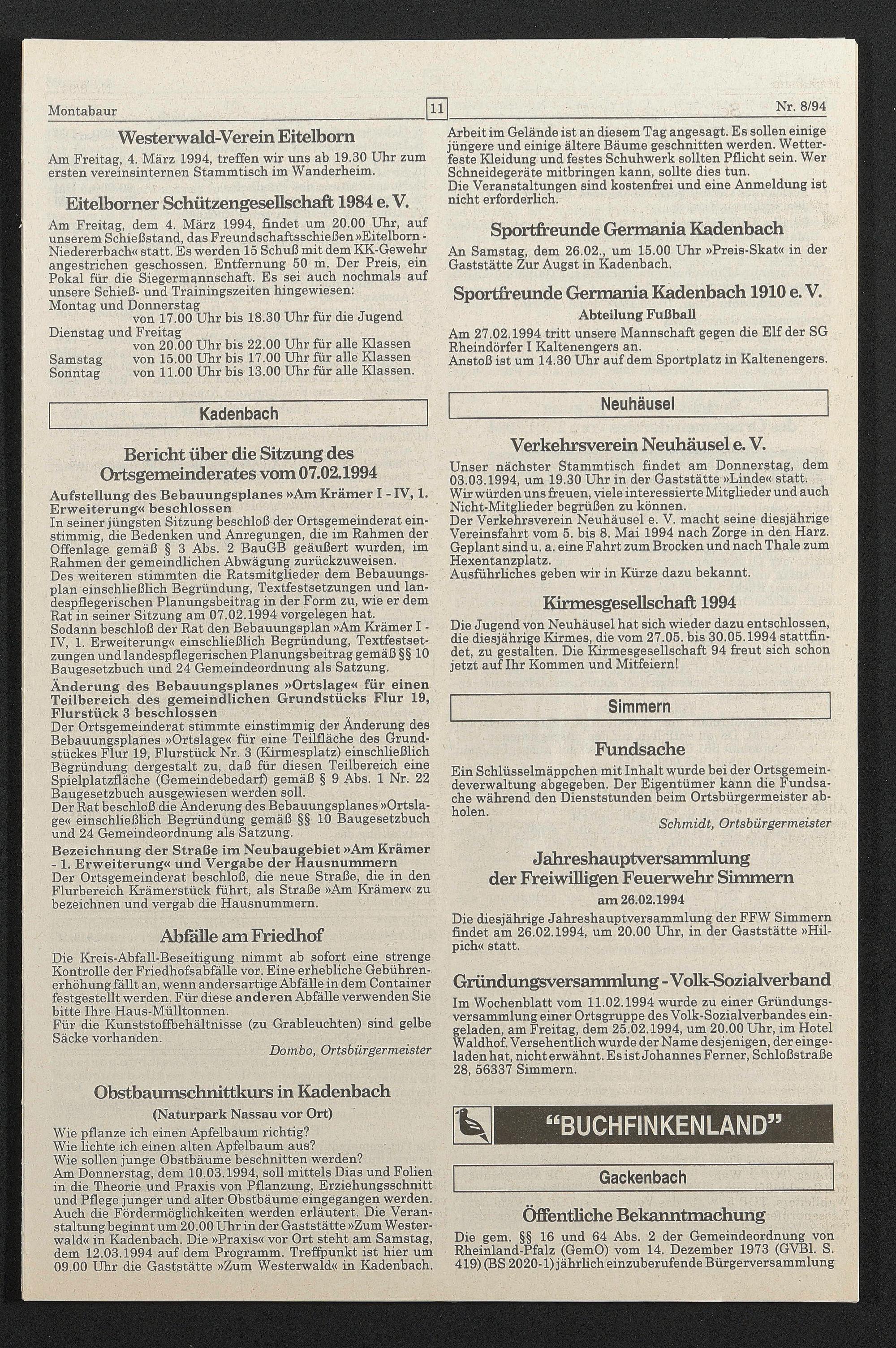 Bericht über die Sitzung des Ortsgemeinderates vom 07.02.1994