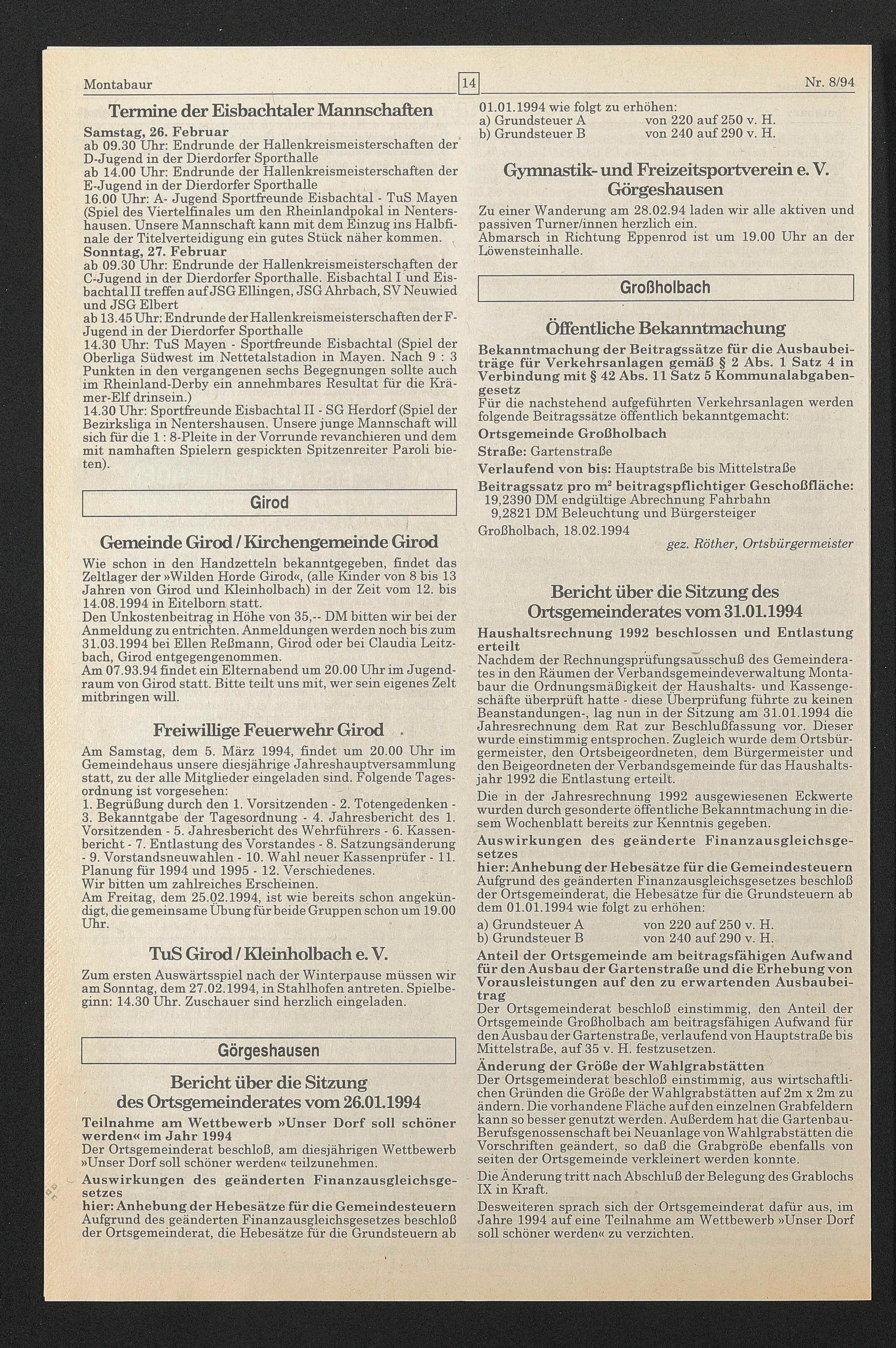 Bericht über die Sitzung des Ortsgemeinderates vom 31.01.1994