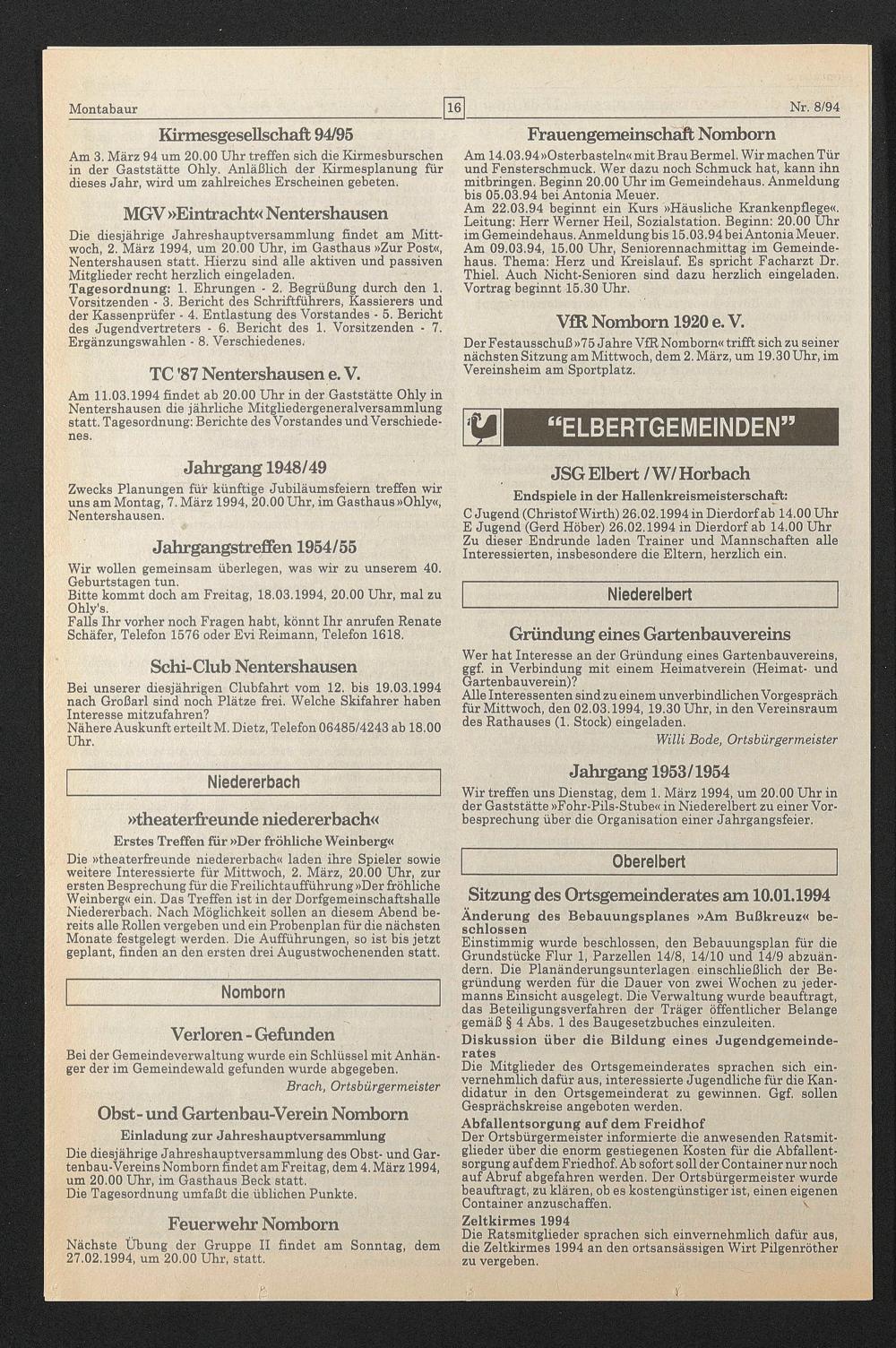 Die diesjährige Jahreshauptversammlung des Obst- und Gartenbau-Vereins Nomborn findet am Freitag, dem 4. März 1994, um 20.00 Uhr, im Gasthaus Beck statt.