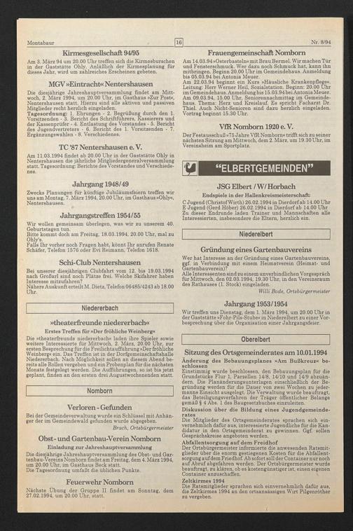 Am 11.03.1994 findet ab 20.00 Uhr in der Gaststätte Ohly in Nentershausen die jährliche Mitgliedergeneralversammlung statt. Tagesordnung: Berichte des Vorstandes und Verschiedenes.