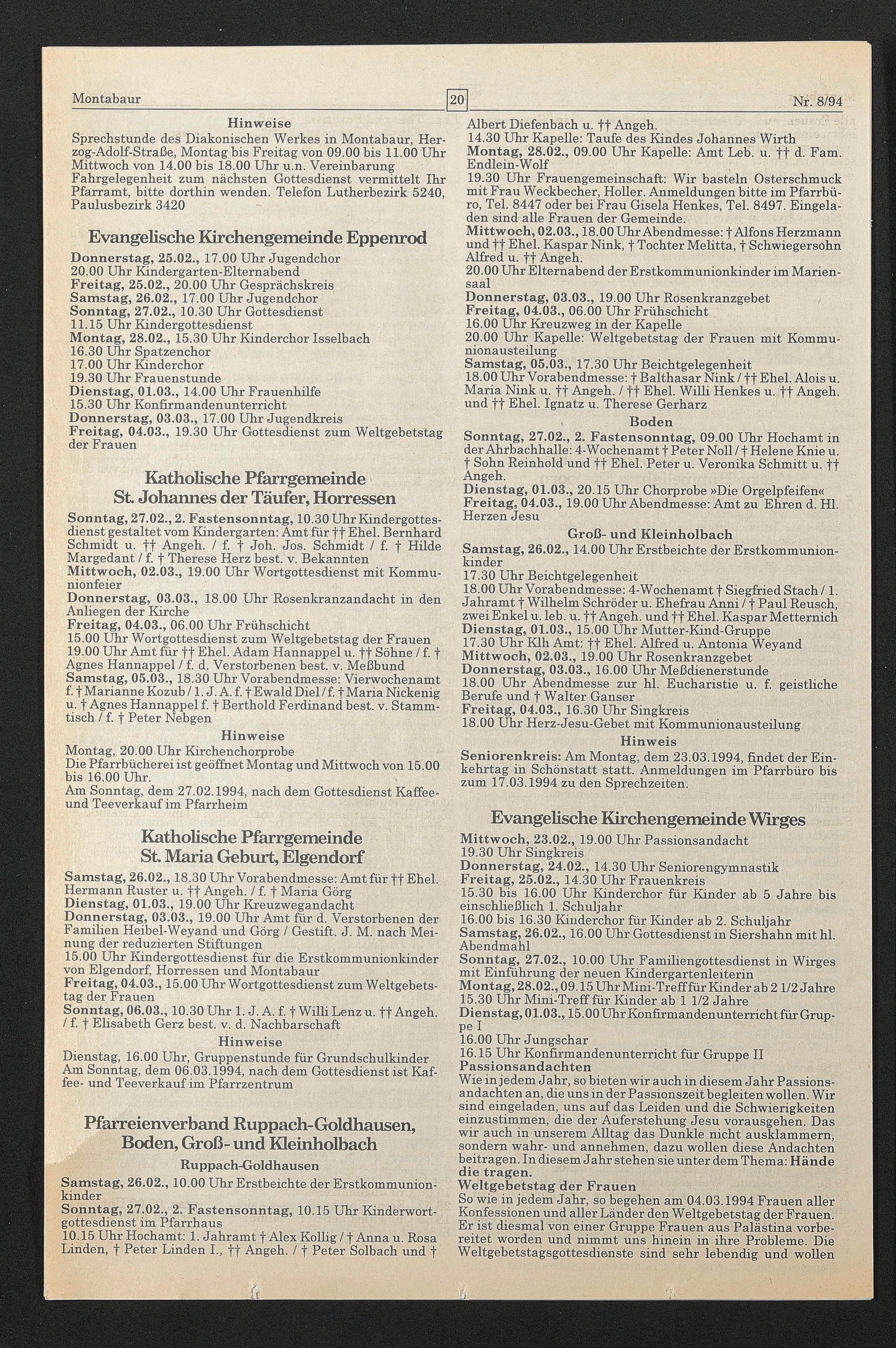 Seniorenkreis: Am Montag, dem 23.03.1994, findet der Einkehrtag in Schönstatt statt. Anmeldungen im Pfarrbüro bis zum 17.03.1994 zu den Sprechzeiten.