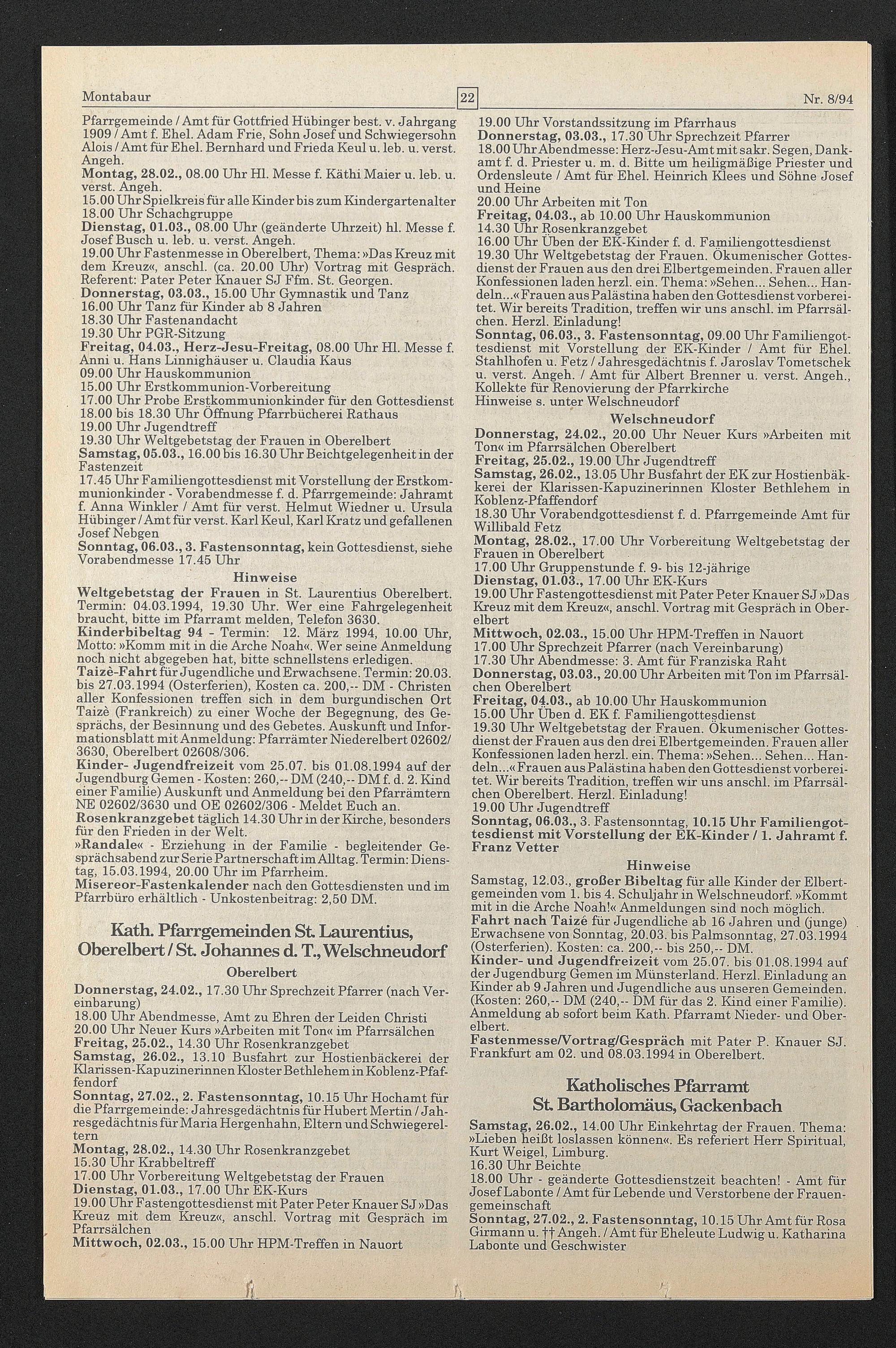 Weltgebetstag der Frauen in St. Laurentius Oberelbert. Termin: 04.03.1994, 19.30 Uhr. Wer eine Fahrgelegenheit braucht, bitte im Pfarramt melden, Telefon 3630. Kinderbibeltag 94 - Termin: 12. März 1994, 10.00 Uhr, Motto: »Komm mit in die Arche Noah«. Wer seine Anmeldung noch nicht abgegeben hat, bitte schnellstens erledigen. Taize-Fahrt für Jugendliche und Erwachsene. Termin: 20.03. bis 27.03.1994 (Osterferien), Kosten ca. 200,-- DM - Christen aller Konfessionen treffen sich in dem burgundischen Ort Taize (Frankreich) zu einer Woche der Begegnung, des Gesprächs, der Besinnung und des Gebetes. Auskunft und Informationsblatt mit Anmeldung: Pfarrämter Niederelbert 02602/ 3630, Oberelbert 02608/306.