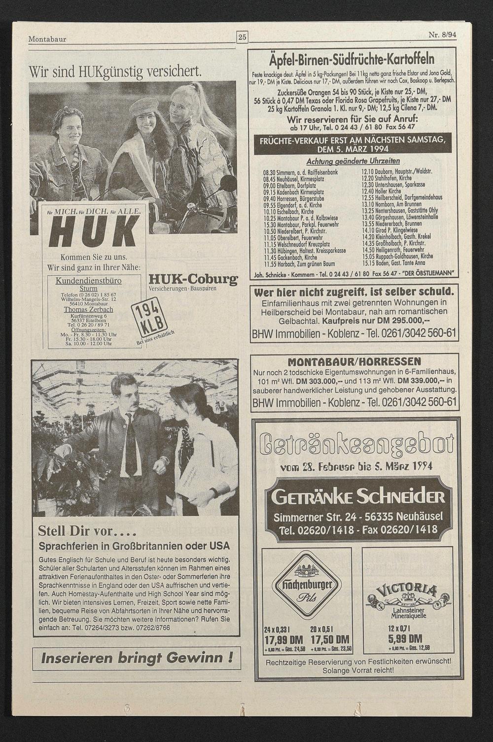 FRÜCHTE-VERKAUF ERST AM NÄCHSTEN SAMSTAG, DEM 5. MÄRZ 1994