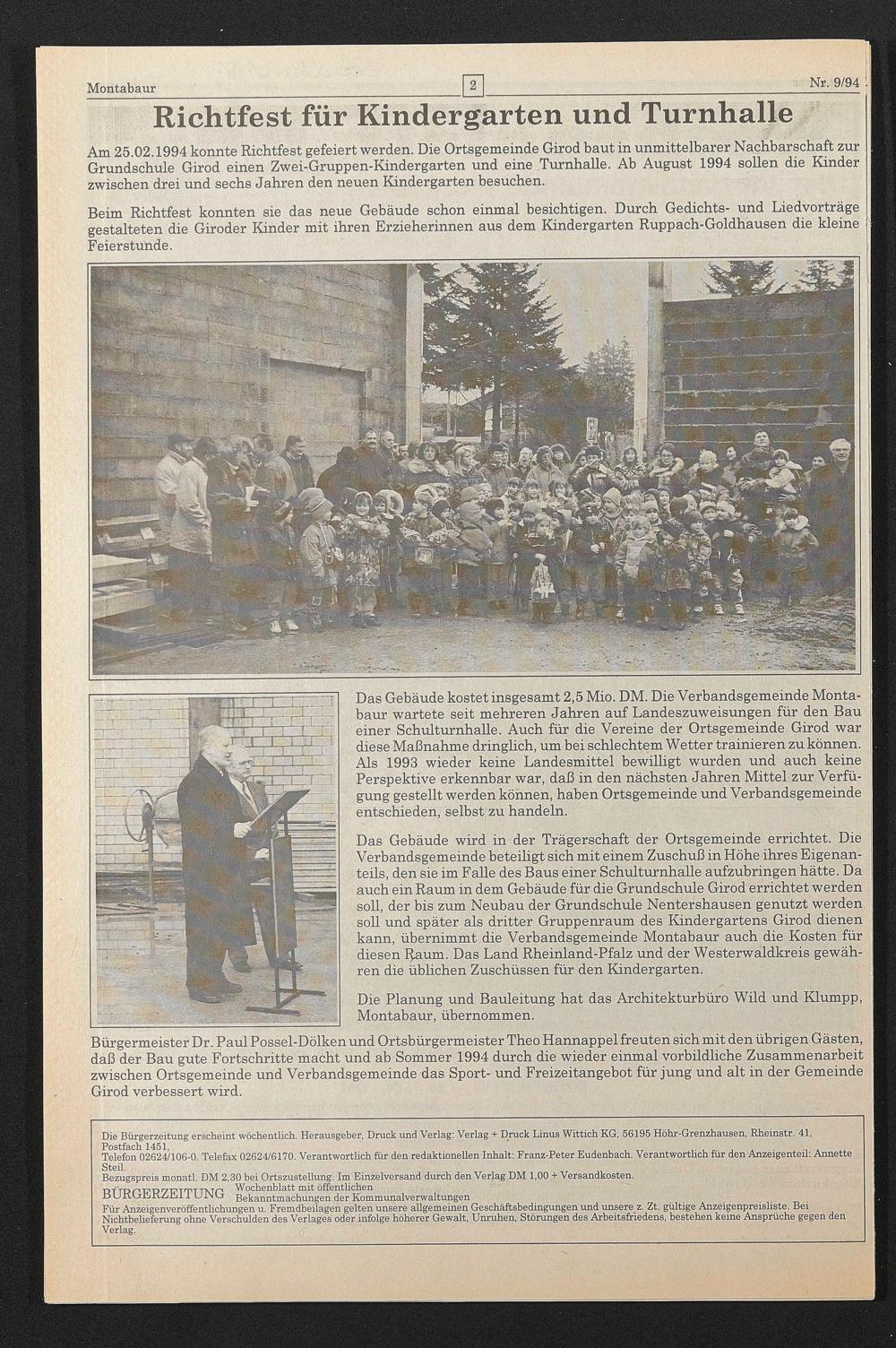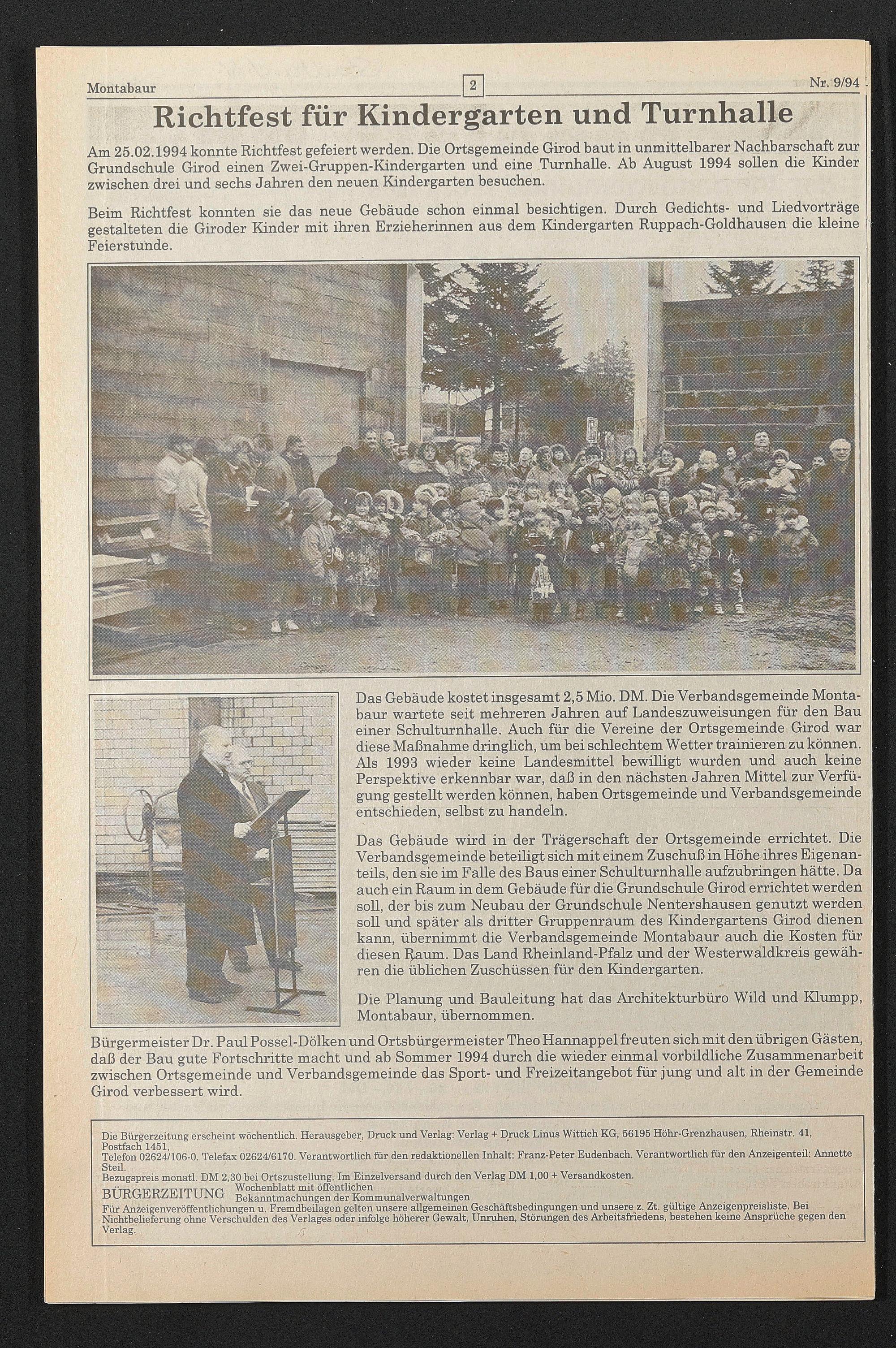 Am 25.02.1994 konnte Richtfest gefeiert werden. Die Ortsgemeinde Girod baut in unmittelbarer Nachbarschaft zur Grundschule Girod einen Zwei-Gruppen-Kindergarten und eine Turnhalle. Ab August 1994 sollen die Kinder zwischen drei und sechs Jahren den neuen Kindergarten besuchen.