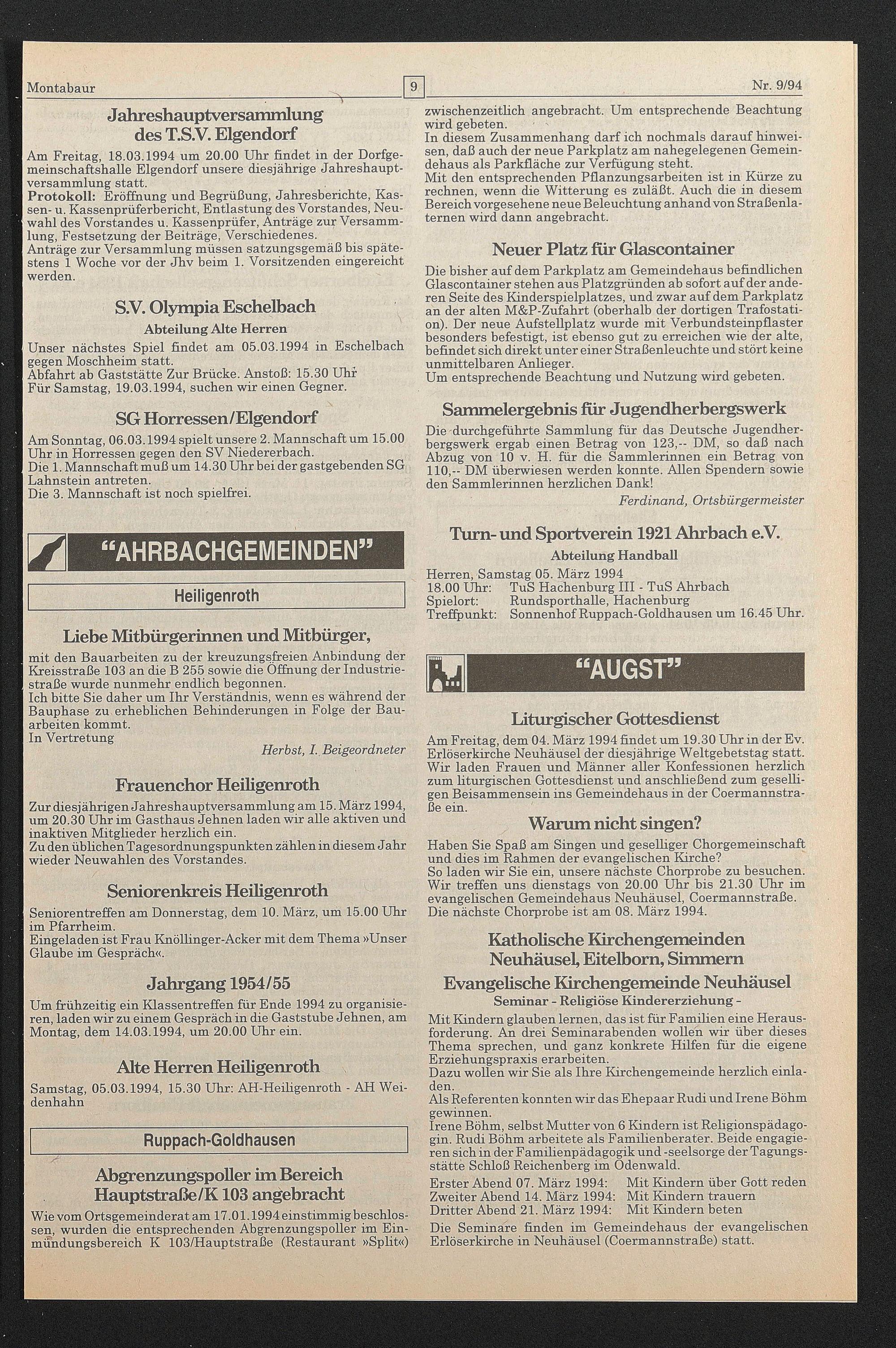 Am Freitag, 18.03.1994 um 20.00 Uhr findet in der Dorfgemeinschaftshalle Eigendorf unsere diesjährige Jahreshauptversammlung statt.