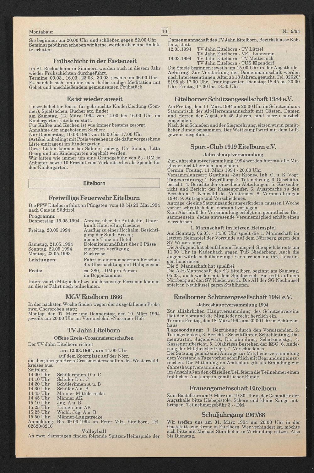Wir treffen uns am 01. März 1994 um 20.00 Uhr in der Gaststätte zur Krone in Eitelborn. Wer verhindert ist, möchte sich bitte mit Michael Stahlhofen in Verbindung setzen. Also bis Dienstag. 9