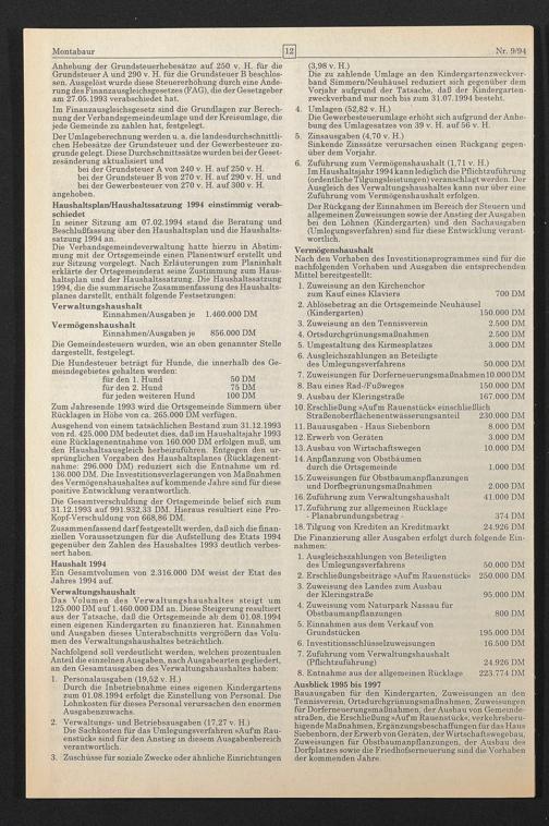 Die Verbandsgemeindeverwaltung hatte hierzu in Abstimmung mit der Ortsgemeinde einen Planentwurf erstellt und zur Sitzung vorgelegt. Nach Erläuterungen zum Planinhalt erklärte der Ortsgemeinderat seine Zustimmung zum Haushaltsplan und der Haushaltssatzung. Die Haushaltssatzung 1994, die die summarische Zusammenfassung des Haushaltsplanes darstellt, enthält folgende Festsetzungen: