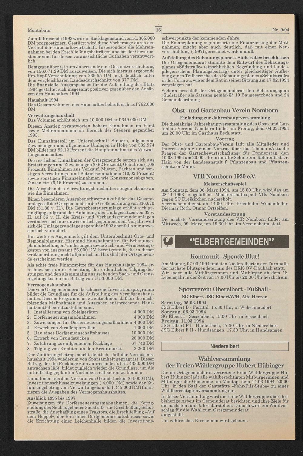 Die diesjährige Jahreshauptversammlung des Obst- und Gartenbau-Vereins Nomborn findet am Freitag, dem 04.03.1994 um 20.00 Uhr im Gasthaus Beck statt.
