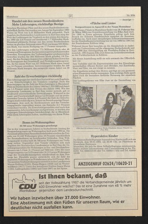 In der Naspa-Filiale in Montabaur findet vom 18. Februar bis 18. März 1994 eine Gemäldeausstellung von Elke Just statt. Die 1966 in Essen geborene Künstlerin schlug nach dem Besuch der Höheren Handelsschule zunächst die Beamtenlaufbahn ein. Nach einer zweijährigen Zollanwärterinnenzeit bei der Bundesfinanzverwaltung war sie von 1986 bis 1991 bei der Bundeskasse Koblenz tätig.