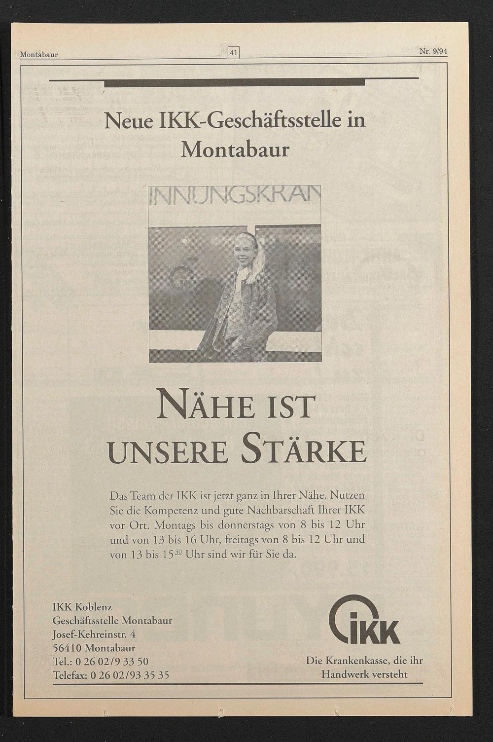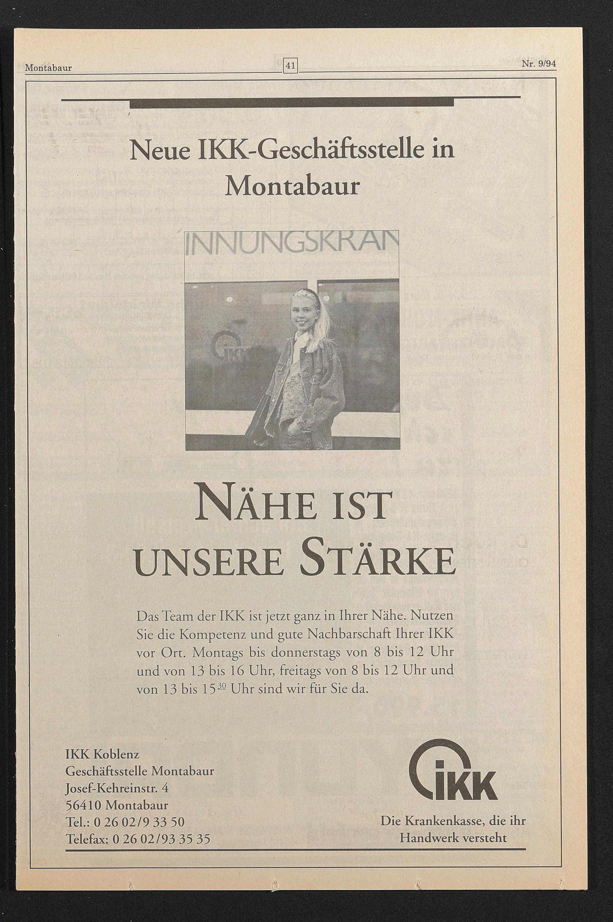Das Team der IKK ist jetzt ganz in Ihrer Nähe. Nutzen Sie die Kompetenz und gute Nachbarschaft Ihrer IKK vor Ort. Montags bis donnerstags von 8 bis 12 Uhr und von 13 bis 16 Uhr, freitags von 8 bis 12 Uhr und von 13 bis 15 22 Uhr sind wir für Sie da.