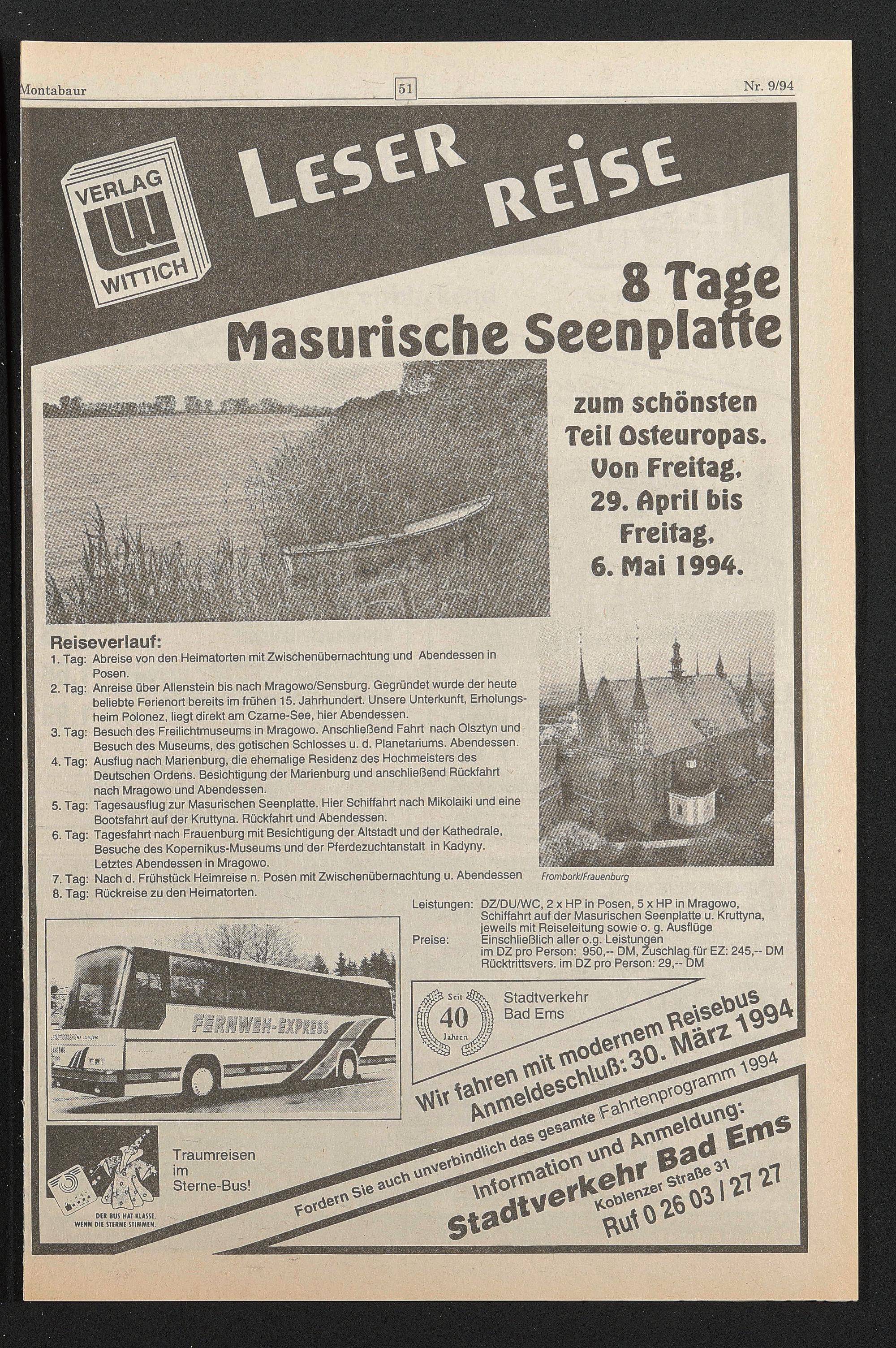 Schiffahrt auf der Masurischen Seenplatte u. Kruttyna, jeweils mit Reiseleitung sowie o. g. Ausflüge Preise: Einschließlich aller o.g. Leistungen
