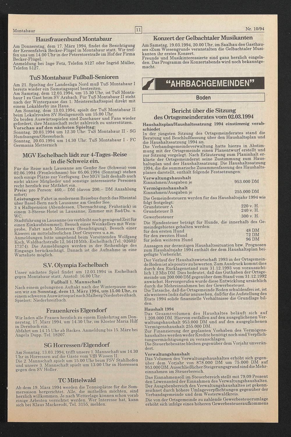 Bericht über die Sitzung des Ortsgemeinderates vom 02.03.1994