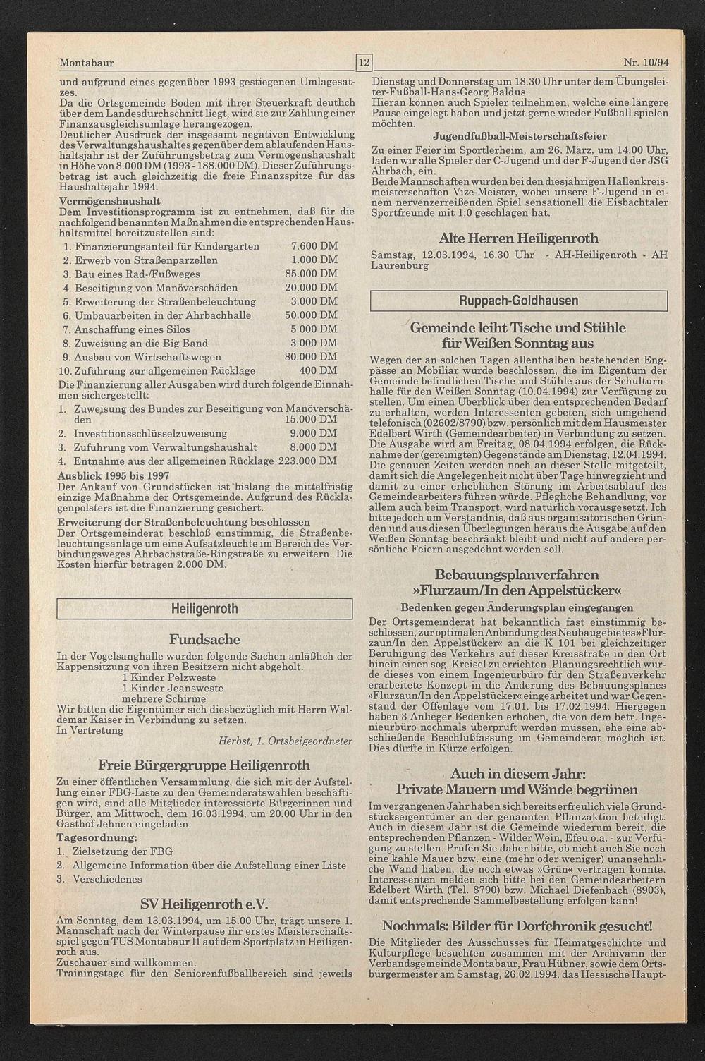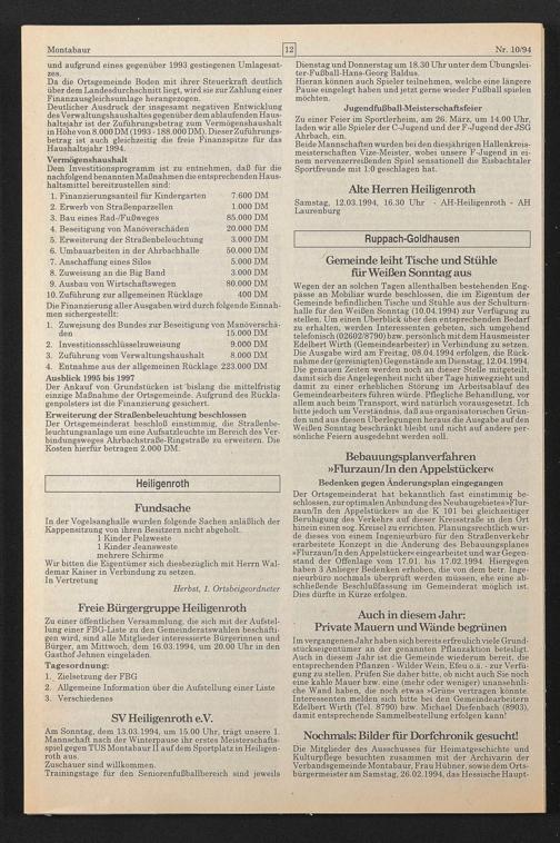 Am Sonntag, dem 13.03.1994, um 15.00 Uhr, trägt unsere 1. Mannschaft nach der Winterpause ihr erstes Meisterschaftsspiel gegen TUS Montabaur II auf dem Sportplatz in Heiligenroth aus.