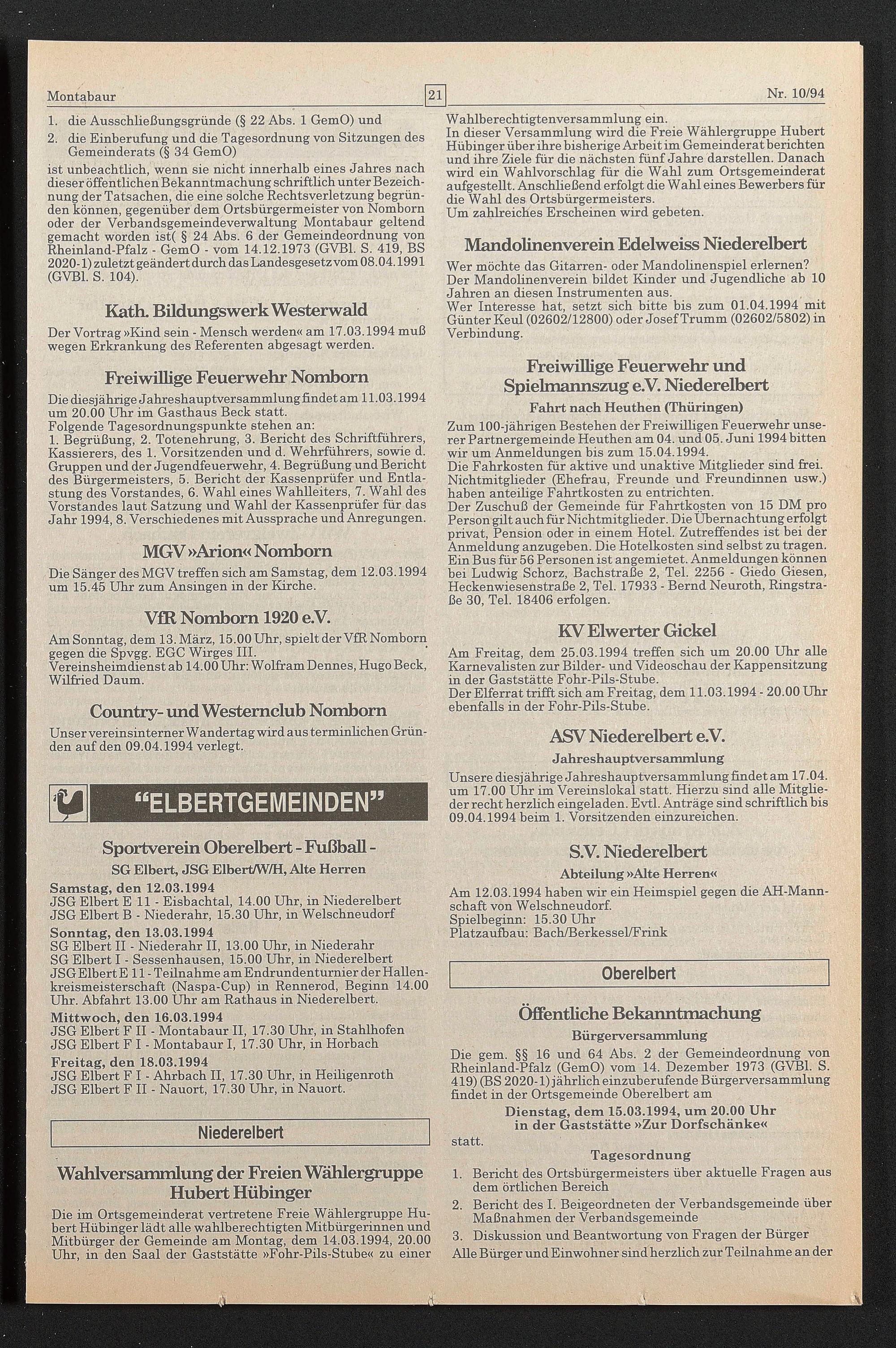 Die gern. §§ 16 und 64 Abs. 2 der Gemeindeordnung von Rheinland-Pfalz (GemO) vom 14. Dezember 1973 (GVB1. S. 419) (BS 2020-1) jährlich einzuberufende Bürgerversammlung findet in der Ortsgemeinde Oberelbert am