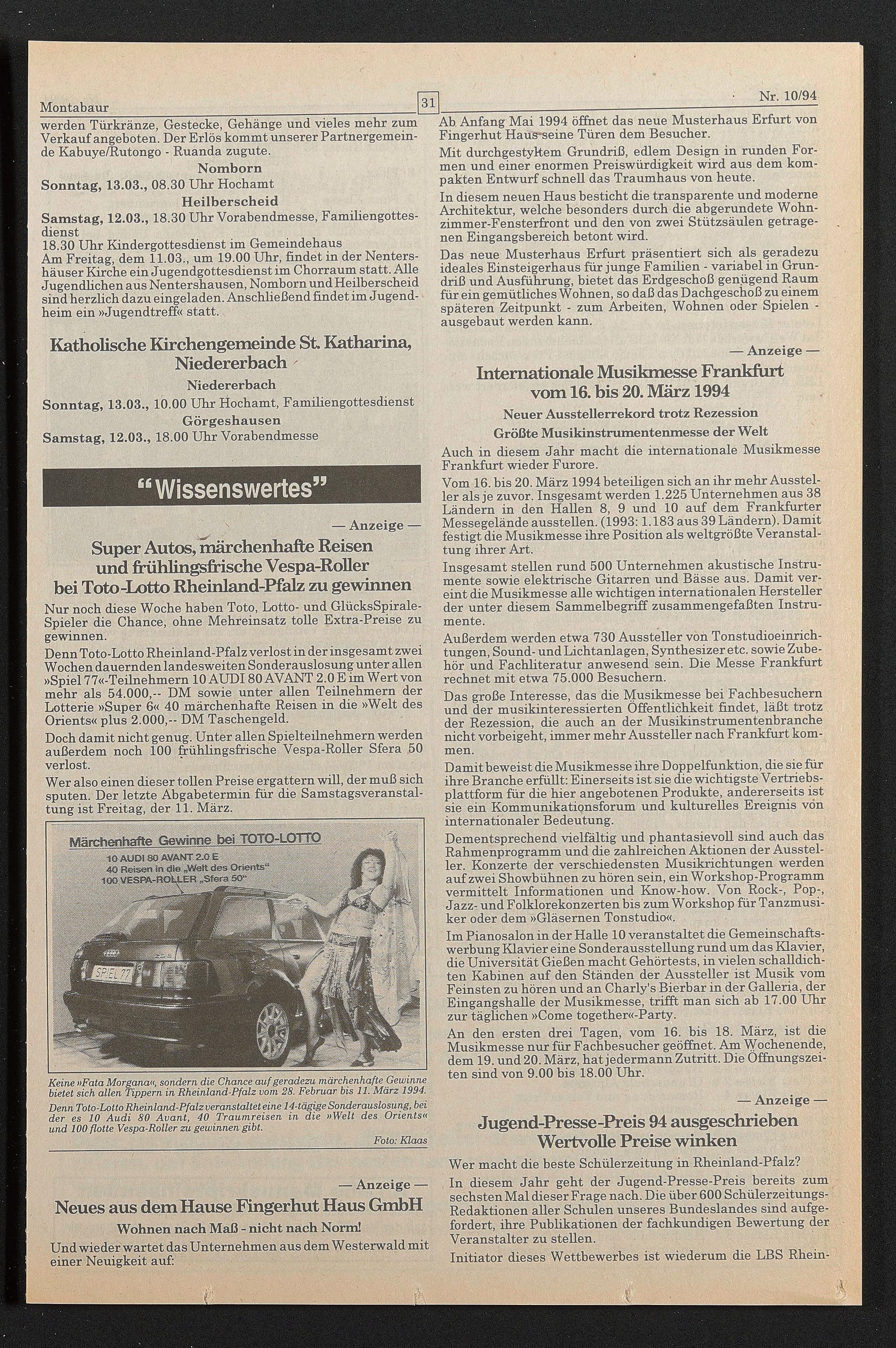 Denn Toto-Lotto Rheinland-Pfalz verlost in der insgesamt zwei Wochen dauernden landesweiten Sonderauslosung unter allen »Spiel 77«-Teilnehmern 10 AUDI 80 AVANT 2.0 E im Wert von mehr als 54.000,- DM sowie unter allen Teilnehmern der Lotterie »Super 6« 40 märchenhafte Reisen in die »Welt des Orients« plus 2.000,- DM Taschengeld.