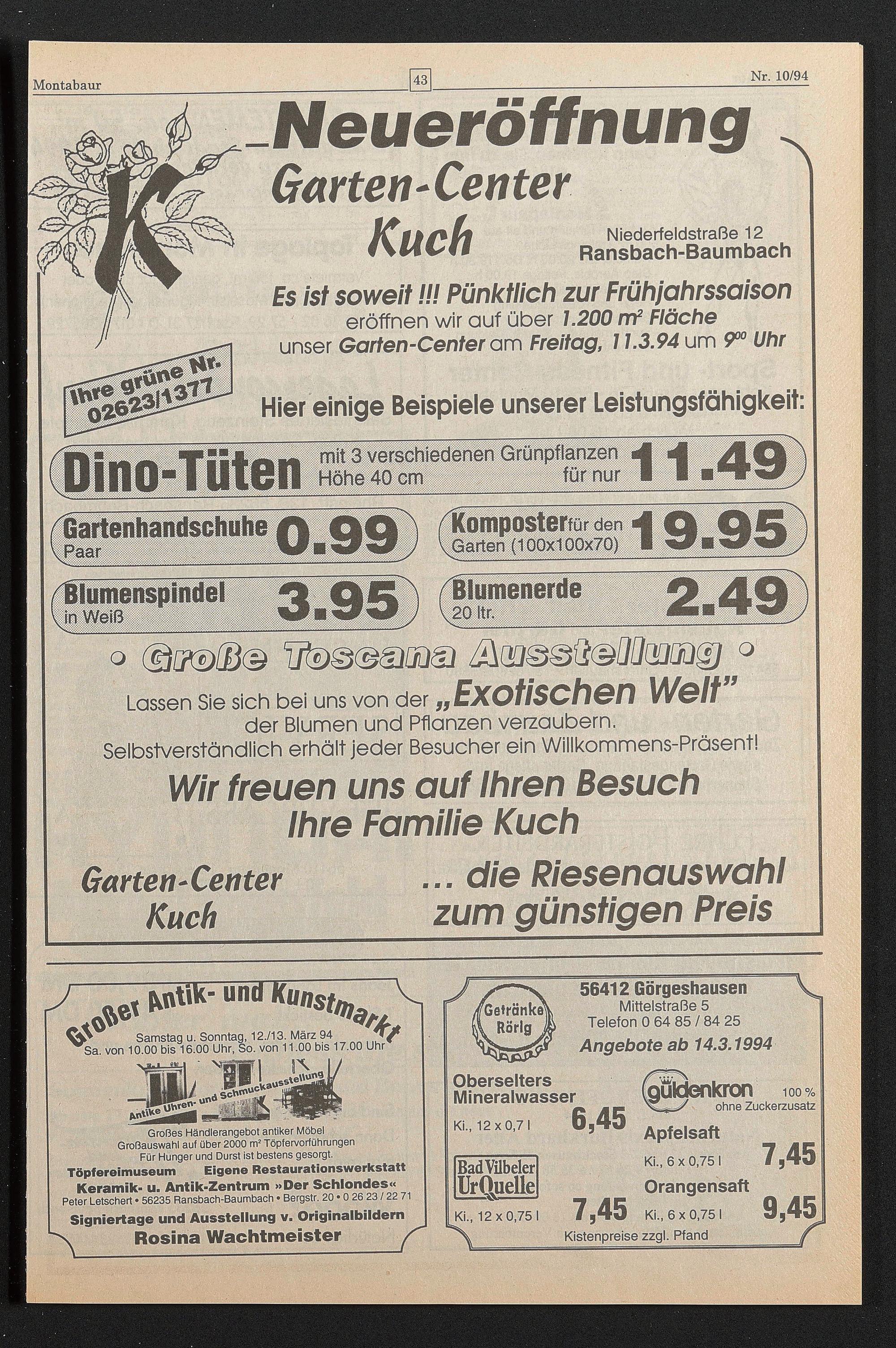 eröffnen wir auf über 1.200 m 2 Fläche unser Garten-Center am Freitag , 7 1.3.94 um 9 00 Uhr