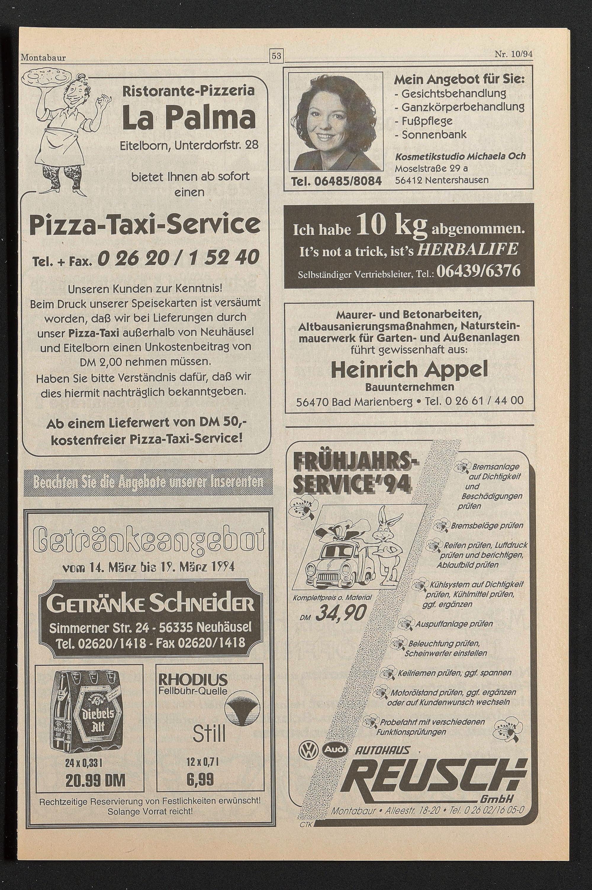 Beim Druck unserer Speisekarten ist versäumt worden, daß wir bei Lieferungen durch unser Pizza-Iäxi außerhalb von Neuhäusel und Eitelborn einen Unkostenbeitrag von DM 2,00 nehmen müssen.