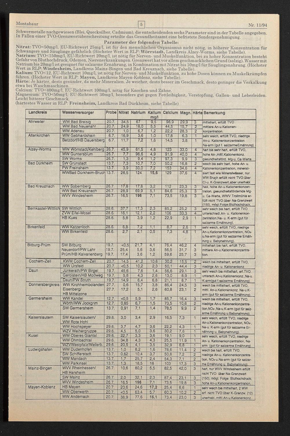 Nitrat: TVO<50mg/l, EU-Richtwert 25mg/l, ist für den menschlichen Organismus nicht nötig, in höherer Konzentration für Schwangere und Säuglinge gefährlich (Höchster Wert in RLP: Wörrstadt, Landkreis Alzey-Worms, siehe Tabelle).