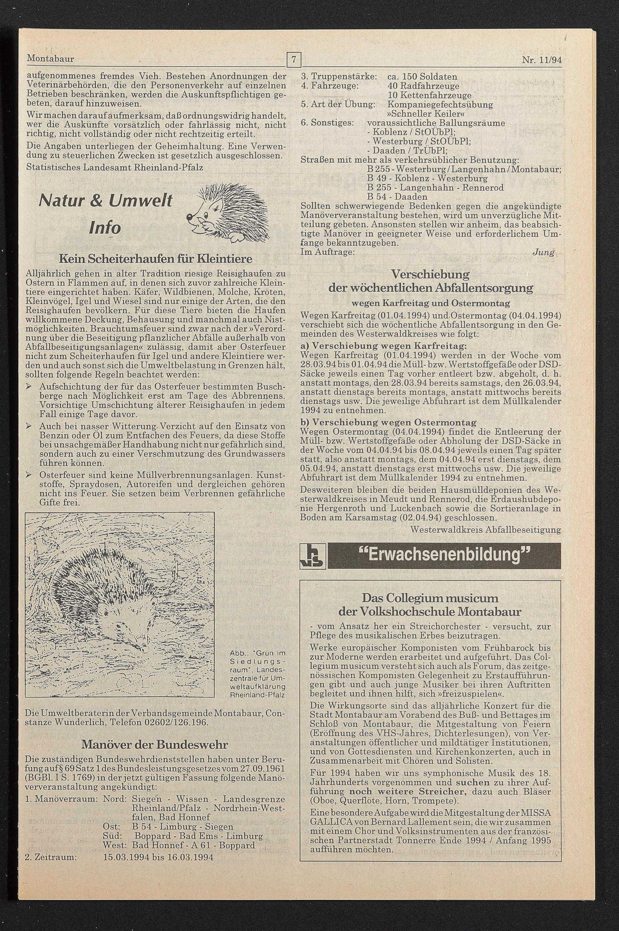 Wegen Ostermontag (04.04.1994) findet die Entleerung der Müll- bzw. Wertstoffgefäße oder Abholung der DSD-Säcke in der Woche vom 04.04.94 bis 08.04.94 jeweils einen Tag später statt, also anstatt montags, dem 04.04.94 erst dienstags, dem 05.04.94, anstatt dienstags erst mittwochs usw. Die jeweilige Abfuhrart ist dem Müllkalender 1994 zu entnehmen. Desweiteren bleiben die beiden Hausmülldeponien des Westerwaldkreises in Meudt und Rennerod, die Erdaushubdeponie Hergenroth und Luckenbach sowie die Sortieranlage in Boden am Karsamstag (02.04.94) geschlossen.