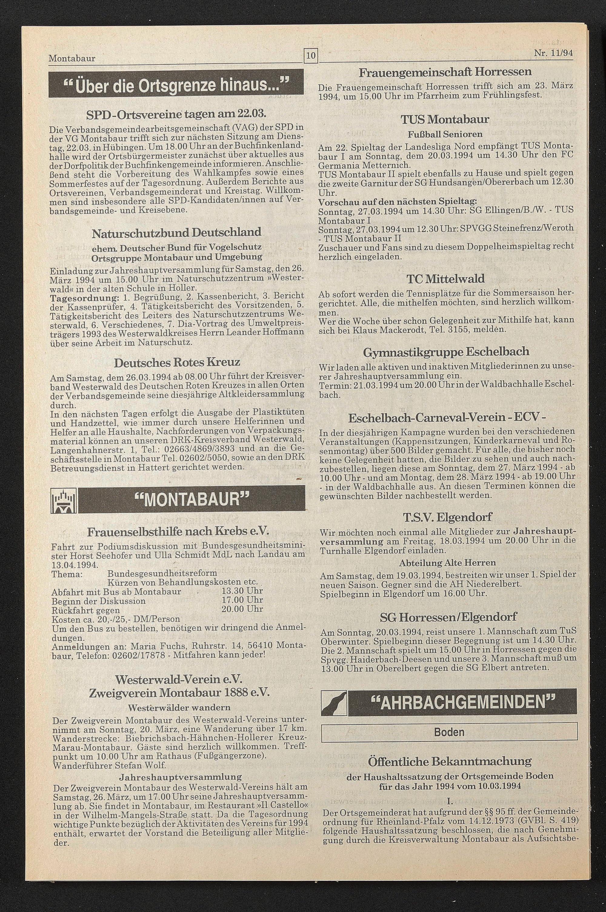 Der Zweigverein Montabaur des Westerwald-Vereins hält am Samstag, 26. März, um 17.00 Uhr seine Jahreshauptversammlung ab. Sie findet in Montabaur, im Restaurant »II Castello« in der Wilhelm-Mangels-Straße statt. Da die Tagesordnung wichtige Punkte bezüglich der Aktivitäten des Vereins für 1994 enthält, erwartet der Vorstand die Beteiligung aller Mitglieder.
