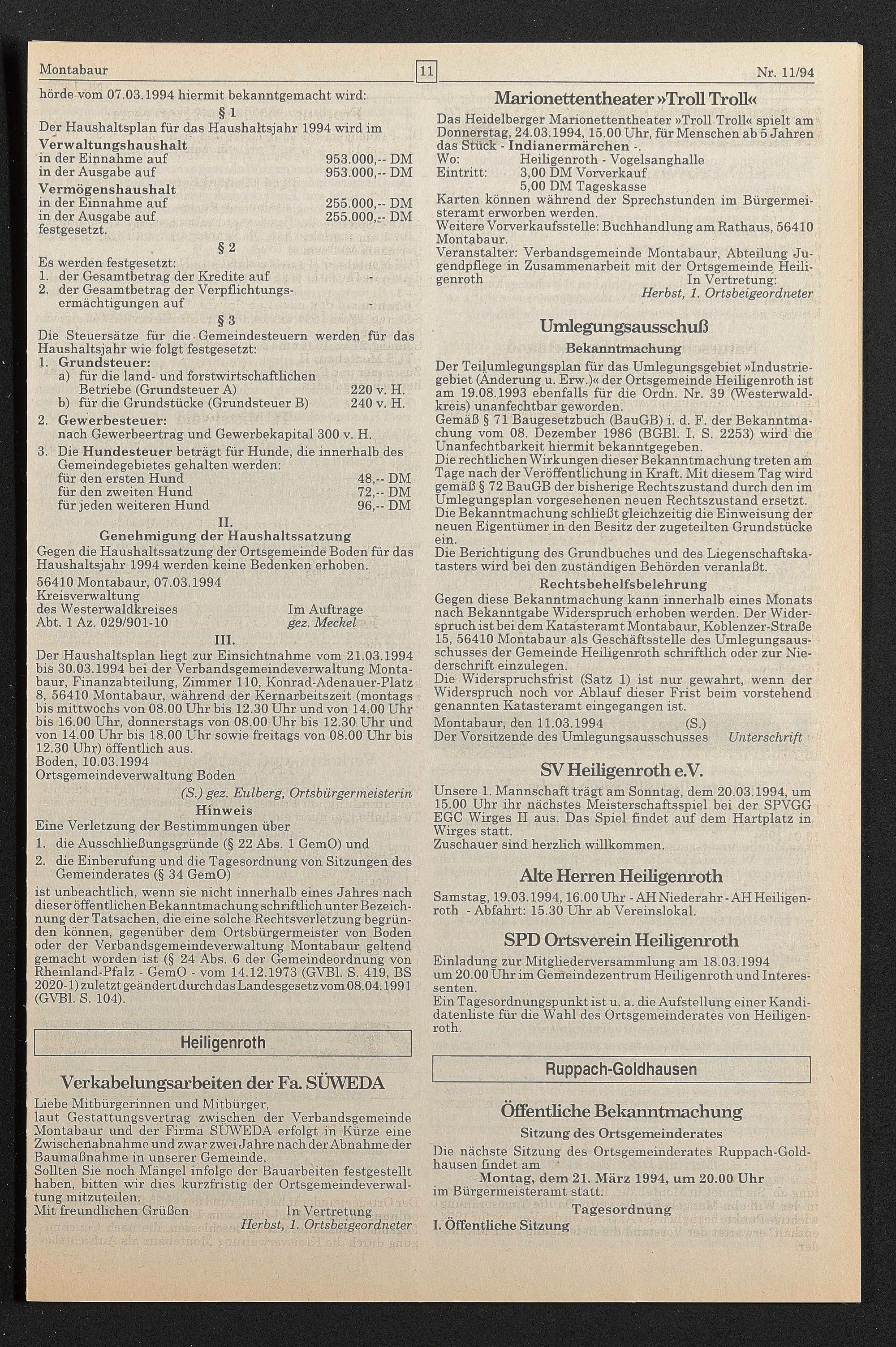 Der Haushaltsplan liegt zur Einsichtnahme vom 21.03.1994 bis 30.03.1994 bei der Verbandsgemeindeverwaltung Montabaur, Finanzabteilung, Zimmer 110, Konrad-Adenauer-Platz 8, 56410 Montabaur, während der Kernarbeitszeit (montags bis mittwochs von 08.00 Uhr bis 12.30 Uhr und von 14.00 Uhr bis 16.00 Uhr, donnerstags von 08.00 Uhr bis 12.30 Uhr und von 14.00 Uhr bis 18.00 Uhr sowie freitags von 08.00 Uhr bis 12.30 Uhr) öffentlich aus.