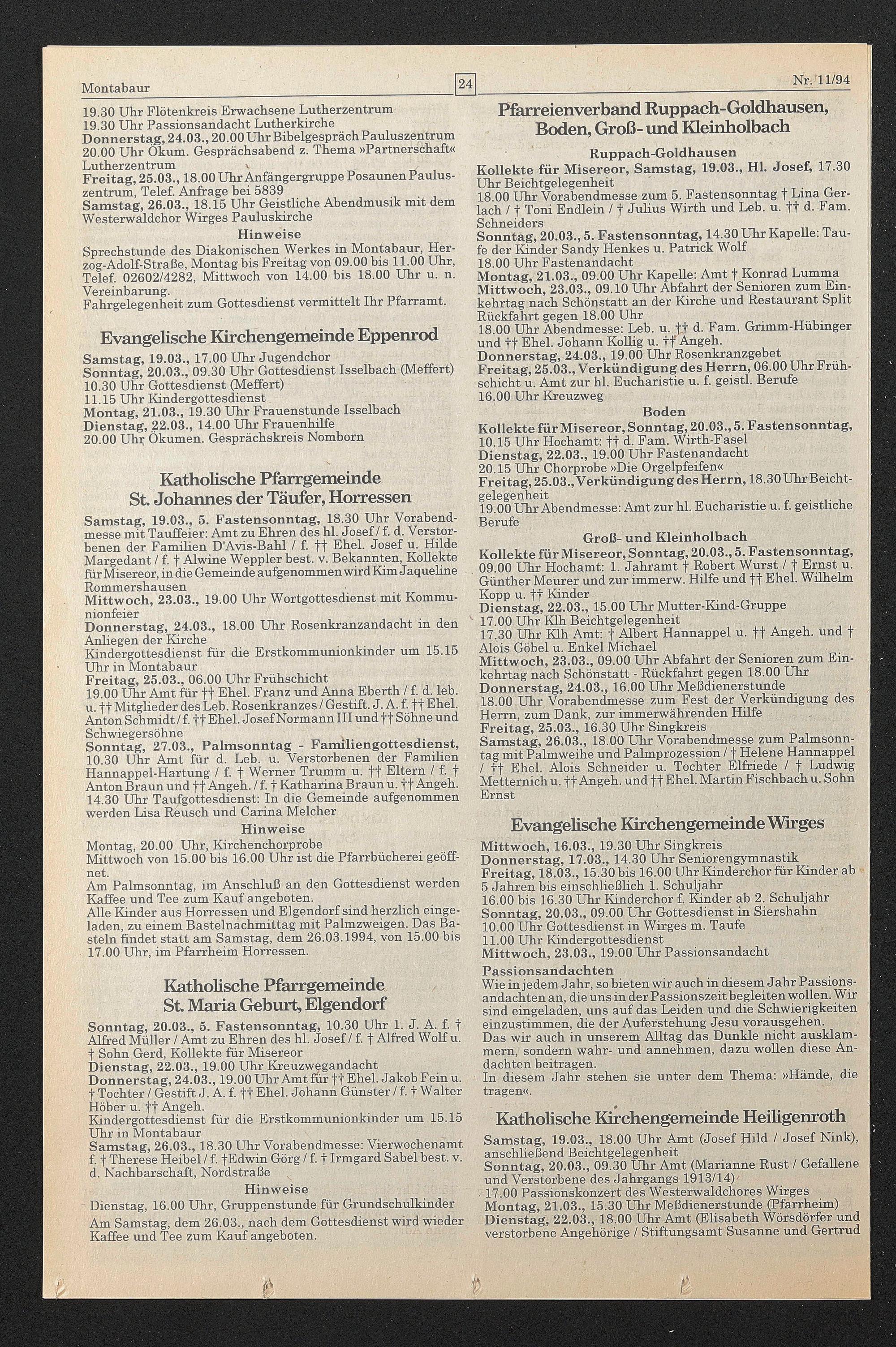 Alle Kinder aus Horressen und Eigendorf sind herzlich eingeladen, zu einem Bastelnachmittag mit Palmzweigen. Das Basteln findet statt am Samstag, dem 26.03.1994, von 15.00 bis 17.00 Uhr, im Pfarrheim Horressen.