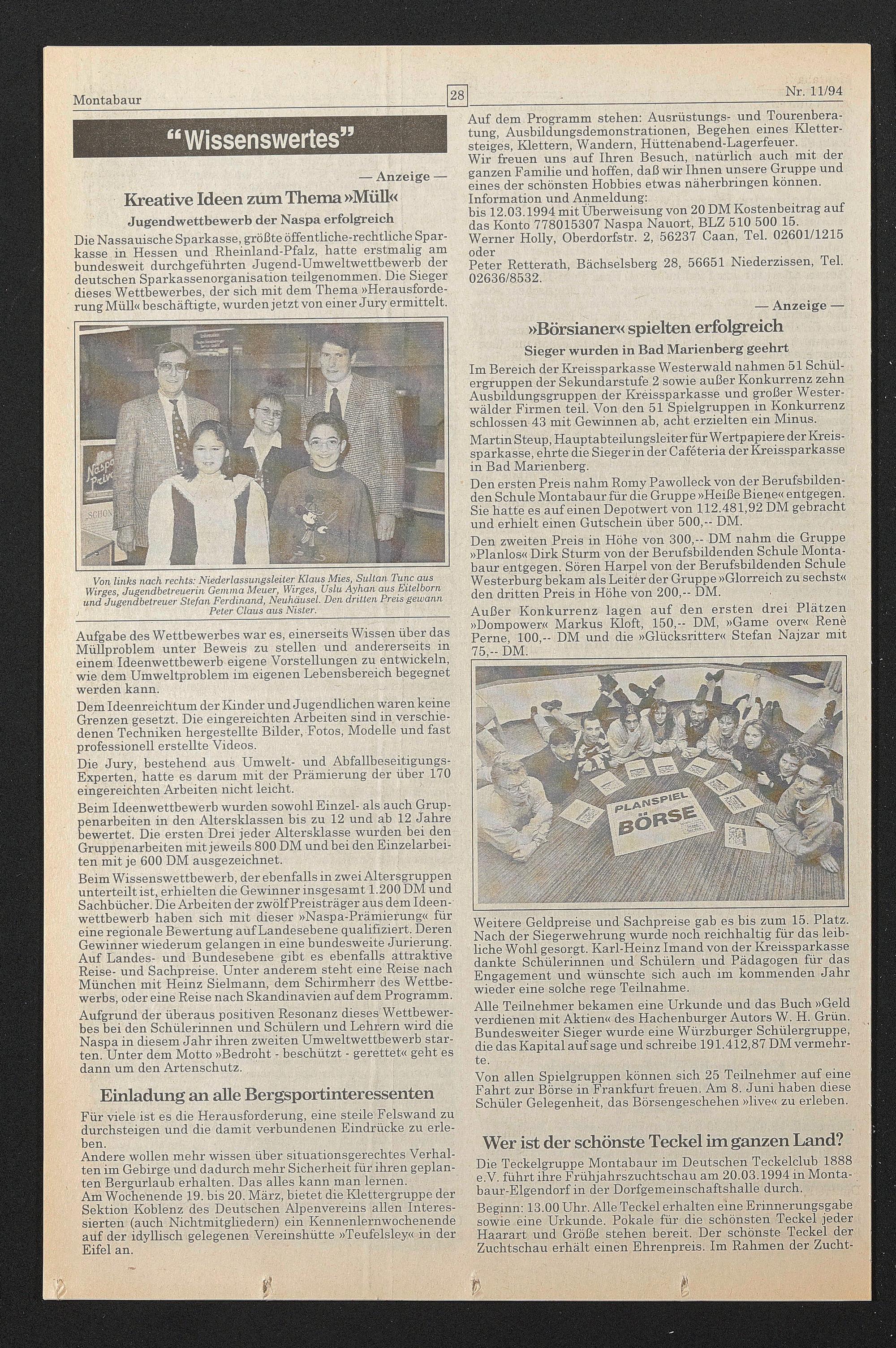 Die Nassauische Sparkasse, größte öffentliche-rechtliche Sparkasse in Hessen und Rheinland-Pfalz, hatte erstmalig am bundesweit durchgeführten Jugend-Umweltwettbewerb der deutschen Sparkassenorganisation teilgenommen. Die Sieger dieses Wettbewerbes, der sich mit dem Thema »Herausforderung Müll« beschäftigte, wurden jetzt von einer Jüry ermittelt.