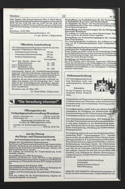 Interessenten können die Ausschreibungsunterlagen beim Arch.-Büro Horst Reichwein, Limburger Straße 55, 65604 Elz, gegen Vorlage eines Verrechnungsschecks in Höhe der o.g. Schutzgebühren schriftlich anfordem. Angebote, die mit einer entsprechenden Aufschrift versehen sein müssen, sind bis Donnerstag, den 7. April 1994 bei der Verbandsgemeinde Montabaur, Bauamt, Zimmer 201, Konrad-Adenauer-Platz 8, 56410 Montabaur, einzureichen. ,