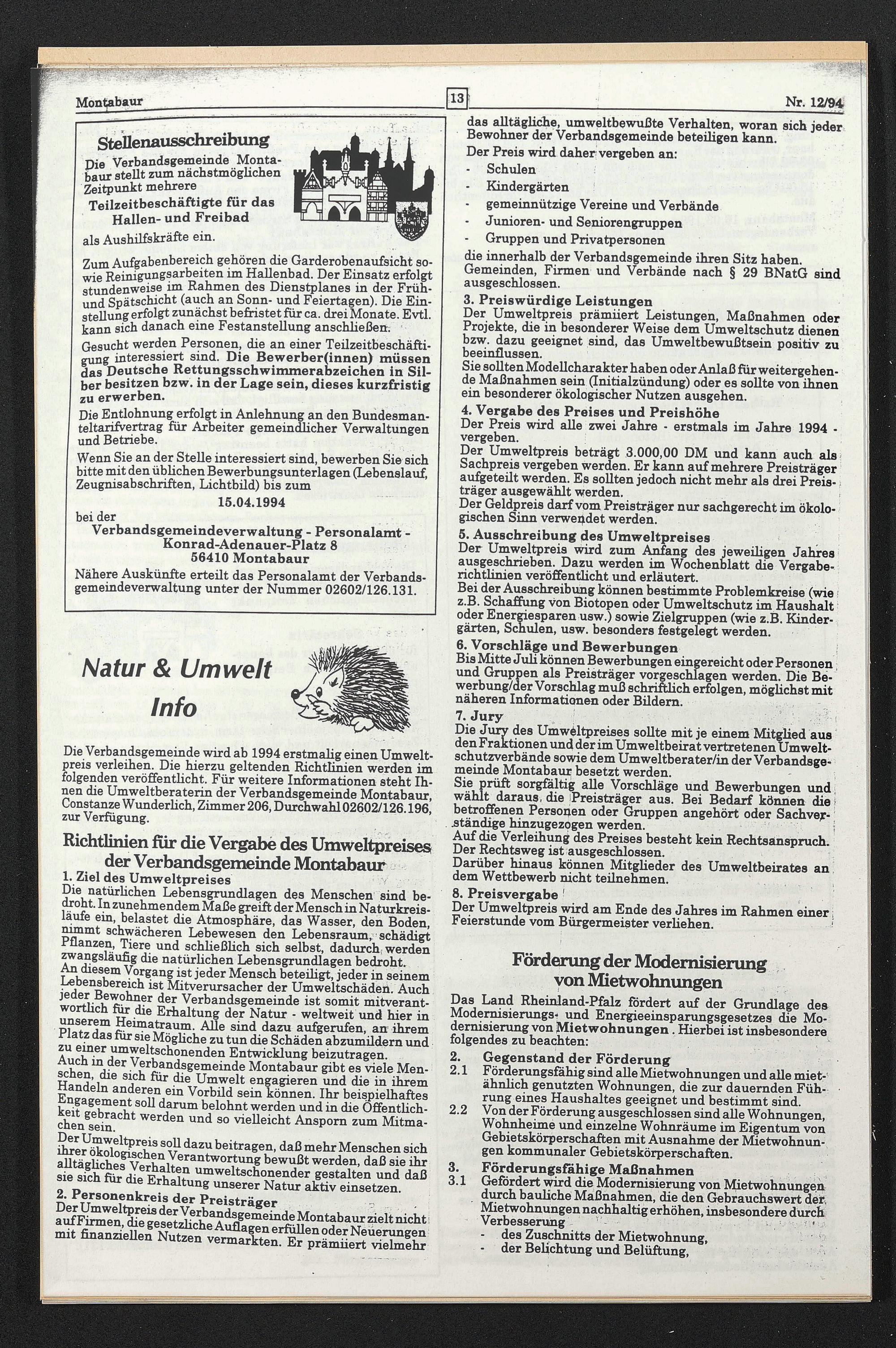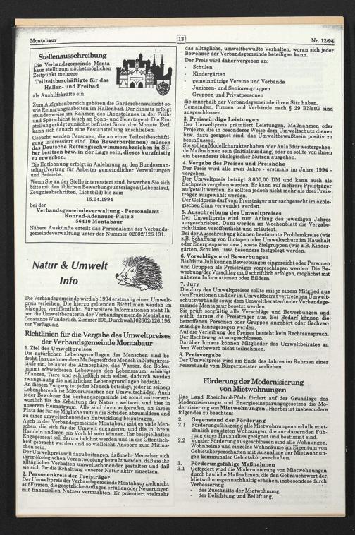 Die Verbandsgemeinde wird ab 1994 erstmalig einen Umweltpreis verleihen. Die hierzu geltenden Richtlinien werden im folgenden veröffentlicht. Für weitere Informationen steht Ihnen die Umweltberaterin der Verbandsgemeinde Montabaur, Constanze Wunderlich, Zimmer 206, Durchwahl02602/126.196, zur Verfügung.