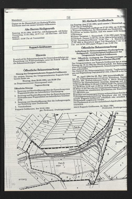 05. April 1994 bis 05. Mai 1994 (einschließlich) bei der Verbandsgemeindeverwaltung Montabaur, Baua Zimmer 203, Konrad-Adenauer-Platz 8, 56410 Montabau während der Kemarbeitszeit (montags, dienstags und mil wochs von 08.00 bis 12.30 und 14.00 bis 16.00 Uhr, donnerst von 08.00 bis 12.30 und 14.00 bis 18.00 Uhr und freitags 1 08.00bis 12.30 Uhr) oder der Ortsgemeinde Ruppach-Gold' sen während der ortsüblichen Sprechzeiten zur Einsichtna me öffentlich aus.