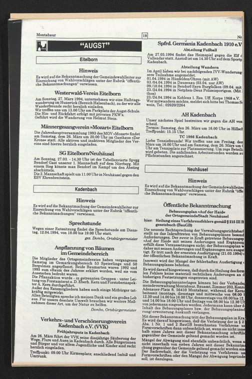 Am 27.03.1994 findet das Heimspiel gegen die Elf d Vallendar statt. Anstoß ist um 14.30 Uhr auf dem Sportp Kadenbach.