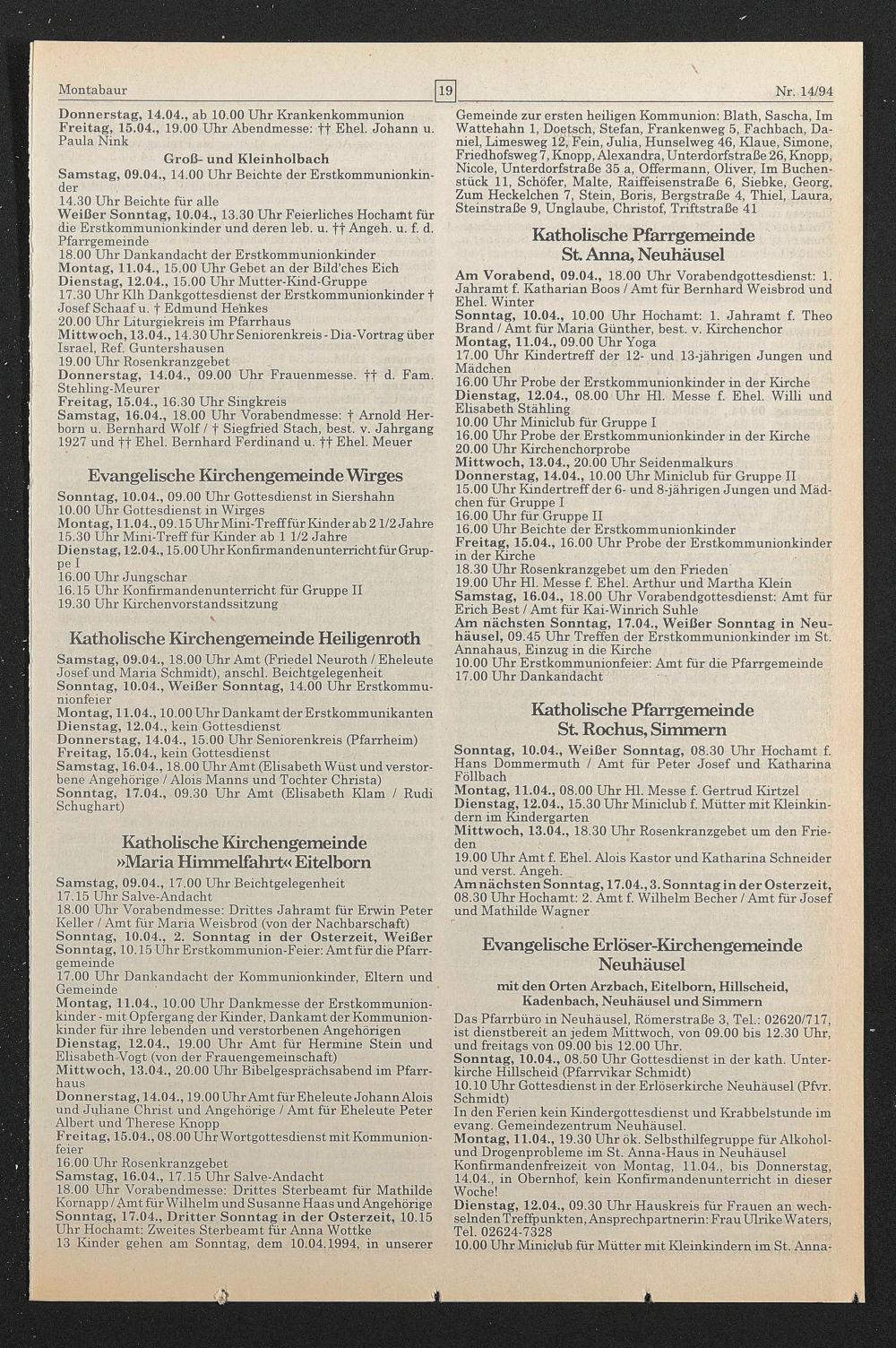 Gemeinde zur ersten heiligen Kommunion: Blath, Sascha, Im Wattehahn 1, Doetsch, Stefan, Frankenweg 5, Fachbach, Daniel, Limesweg 12, Fein, Julia, Hunselweg 46, Klaue, Simone, Friedhofsweg 7, Knopp, Alexandra, Unterdorfstraße 26, Knopp, Nicole, Unterdorfstraße 35 a, Offermann, Oliver, Im Buchenstück 11, Schöfer, Malte, Raiffeisenstraße 6, Siebke, Georg, Zum Heckelchen 7, Stein, Boris, Bergstraße 4, Thiel, Laura, Steinstraße 9, Unglaube, Christof, Triftstraße 41