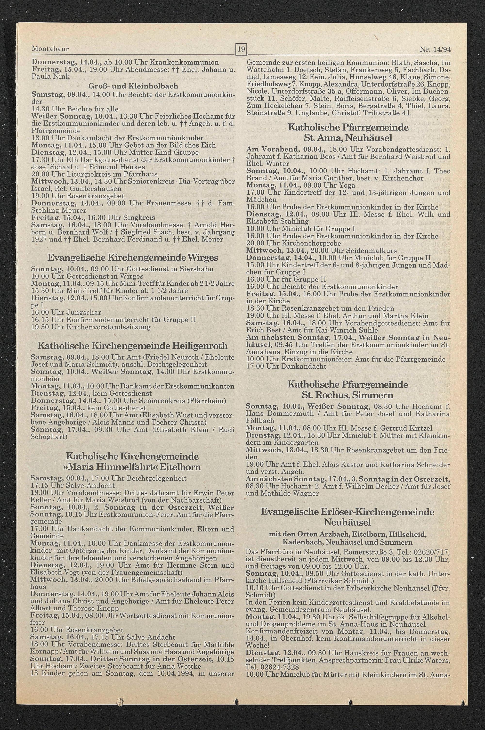 Montag, 11.04., 10.00 Uhr Dankmesse der Erstkommunionkinder - mit Opfergang der Kinder, Dankamt der Kommunionkinder für ihre lebenden und verstorbenen Angehörigen Dienstag, 12.04., 19.00 Uhr Amt für Hermine Stein und Elisabeth-Vogt (von der Frauengemeinschaft)