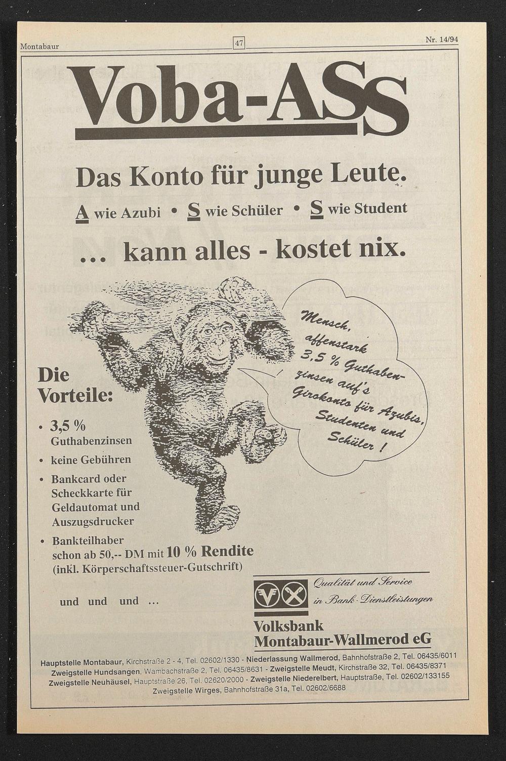 Hauptstelle Montabaur, Kirchstraße 2 - 4, Tel. 02602/1330 - Niederlassung Wallmerod, Bahnhofstraße 2, Tel. 06435/6011 Zweigstelle Hundsangen, Wambachstraße 2, Tel. 06435/8631 - Zweigstelle Meudt, Kirchstraße 32, Tel. 06435/8371 Zweigstelle Neuhäusel, Hauptstraße 26, Tel. 02620/2000 - Zweigstelle Niederelbert, Hauptstraße, Tel. 02602/133155