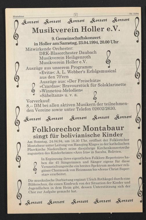 Am Sonntag, 24.04.94, um 16.30 Uhr, eröffnet der Folklorechor Montabaur unter Leitung von Hansjörg Klages in der katholischen Pfarrkirche Niederelbert seine diesjährige Kirchenkonzertreihe zugunsten des Kinderheimes »Arco Iris« in Sacaba, Bolivien.