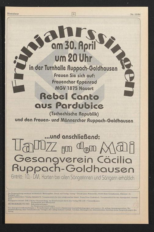 Die Bürgerzeitung erscheint wöchentlich. Herausgeber, Druck und Verlag: Verlag + Druck Linus Wittich KG, 56195 Höhr-Grenzhausen, Rheinstr. 41, Postfach 1451,
