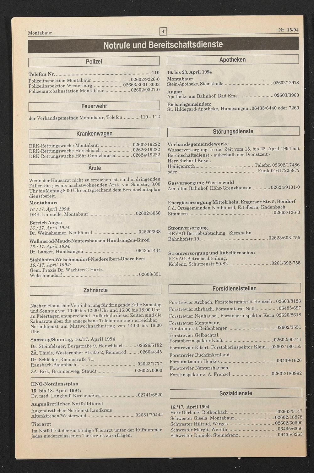 HNO-Notdienstplan 15. bis 18. April 1994: