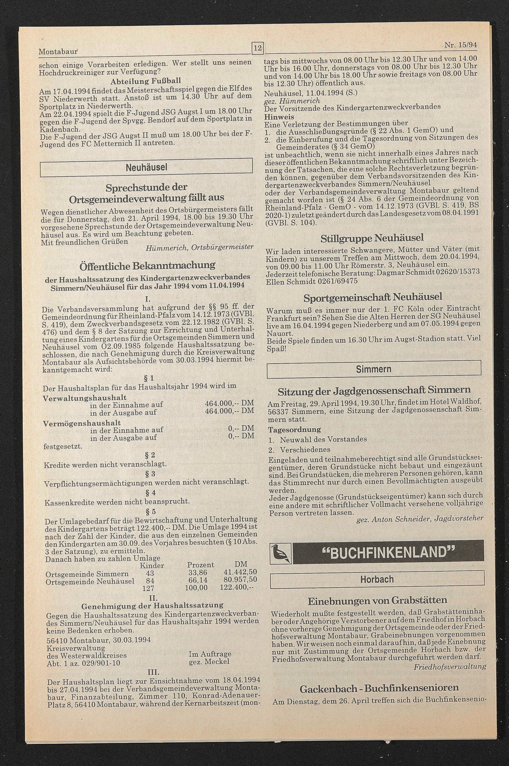 Der Haushaltsplan liegt zur Einsichtnahme vom 18.04.1994 bis 27.04.1994 bei der Verbandsgemeindeverwaltung Montabaur, Finanzabteilung, Zimmer 110, Konrad-Adenauer- Platz8, 56410 Montabaur, während der Kemarbeitszeit (mon