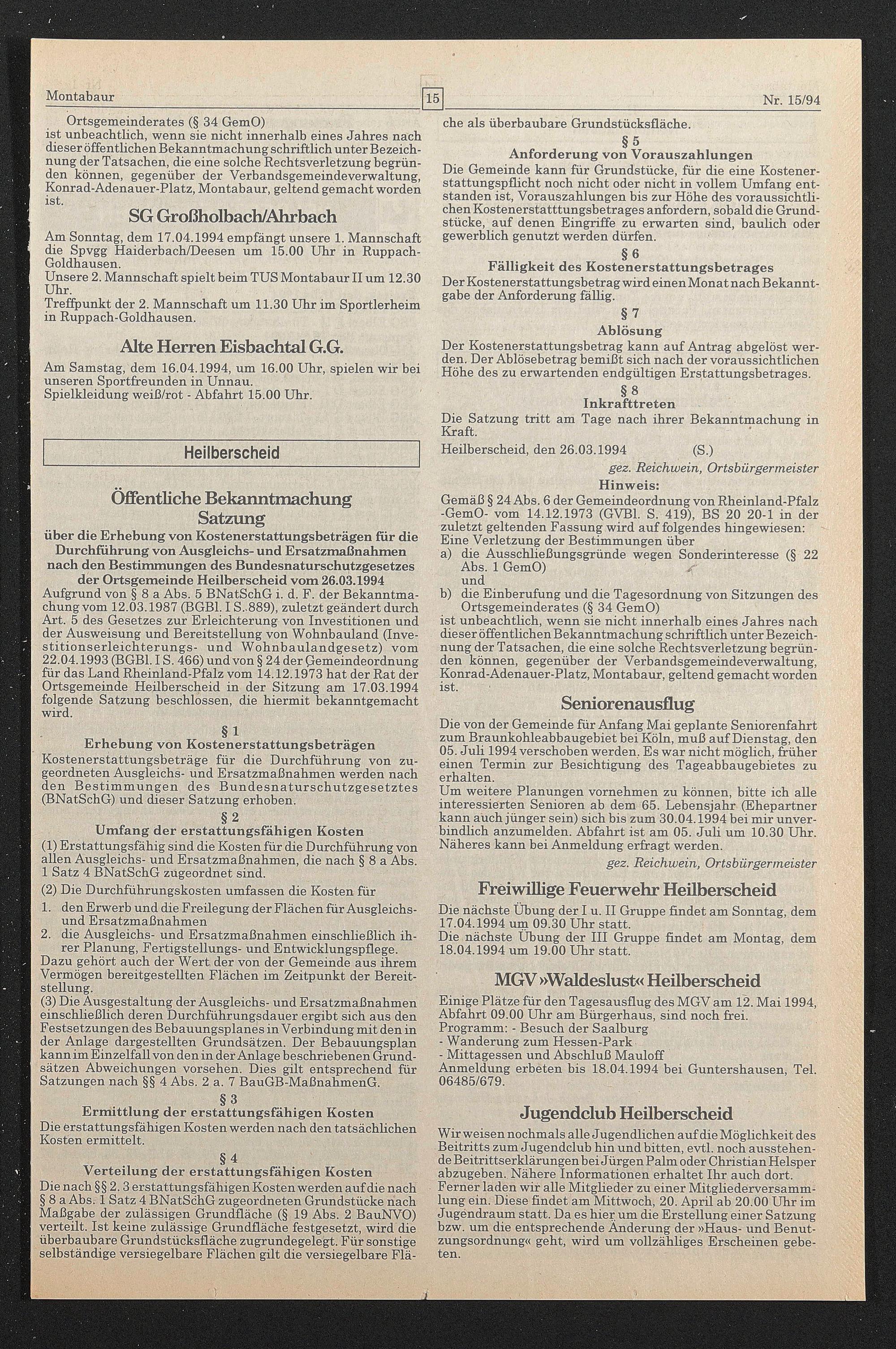 über die Erhebung von Kostenerstattungsbeträgen für die Durchführung von Ausgleichs- und Ersatzmaßnahmen nach den Bestimmungen des Bundesnaturschutzgesetzes der Ortsgemeinde Heilberscheid vom 26.03.1994 Aufgrund von § 8 a Abs. 5 BNatSchG i. d. F. der Bekanntmachung vom 12.03.1987 (BGBl. I S..889), zuletzt geändert durch Art. 5 des Gesetzes zur Erleichterung von Investitionen und der Ausweisung und Bereitstellung von Wohnbauland (Inve- stitionserleichterungs- und Wohnbaulandgesetz) vom 22.04.1993 (BGBl. IS. 466) und von § 24 der Gemeindeordnung für das Land Rheinland-Pfalz vom 14.12.1973 hat der Rat der Ortsgemeinde Heilberscheid in der Sitzung am 17.03.1994 folgende Satzung beschlossen, die hiermit bekanntgemacht wird.