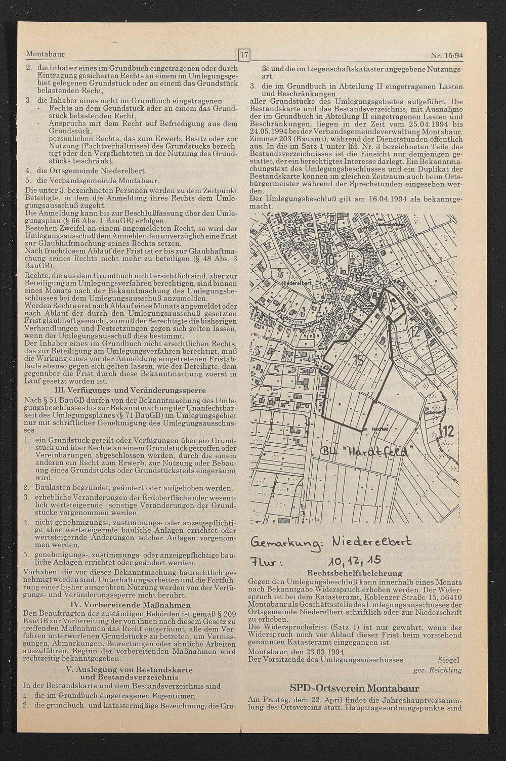 aller Grundstücke des Umlegungsgebietes aufgeführt. Die Bestandskarte und das Bestandsverzeichnis, mit Ausnahme der im Grundbuch in Abteilung II eingetragenen Lasten und Beschränkungen, liegen in der Zeit vom 25.04.1994 bis 24.05.1994 bei der Verbandsgemeindeverwaltung Montabaur, Zimmer 203 (Bauamt), während der Dienststunden öffentlich aus. In die im Satz 1 unter lfd. Nr. 3 bezeichneten Teile des Bestandsverzeichnisses ist die Einsicht nur demjenigen gestattet, der ein berechtigtes Interesse darlegt. Ein Bekanntmachungstext des Umlegungsbeschlusses und ein Duplikat der Bestandskarte können im gleichen Zeitraum auch beim Ortsbürgermeister während der Sprechstunden eingesehen werden.