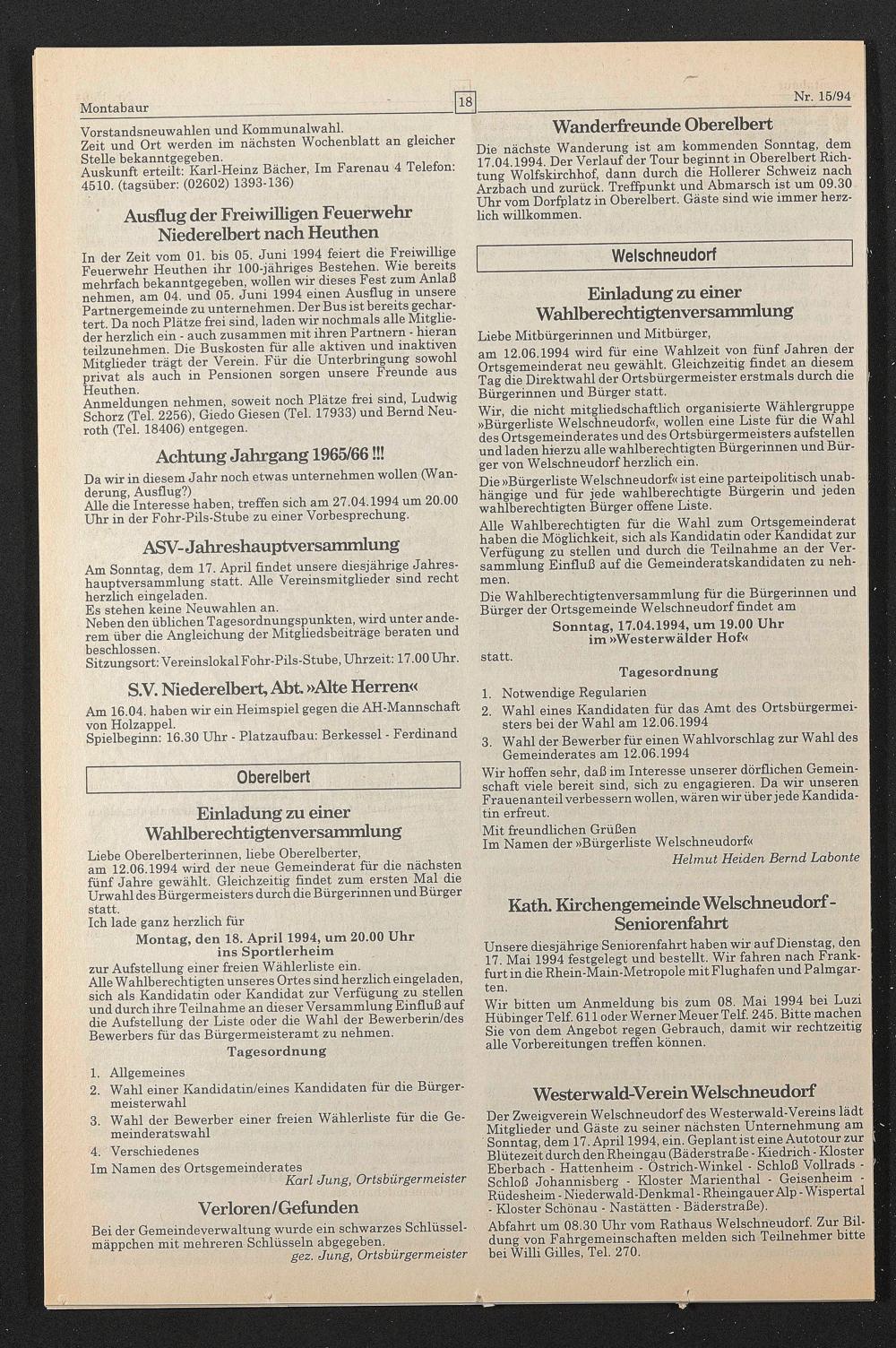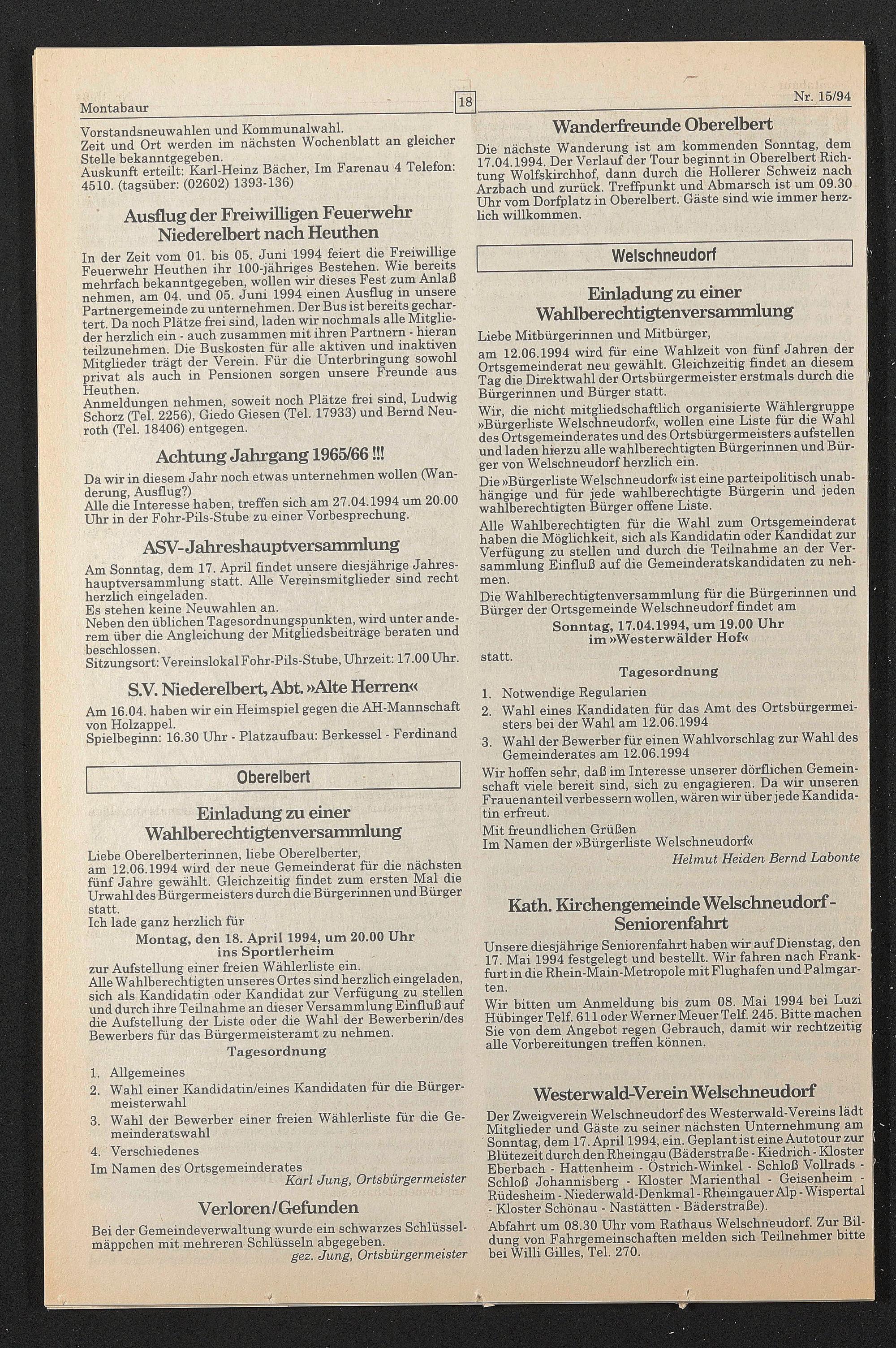 Liebe Oberelberterinnen, liebe Oberelberter, am 12.06.1994 wird der neue Gemeinderat für die nächsten fünf Jahre gewählt. Gleichzeitig findet zum ersten Mal die Urwahl des Bürgermeisters durch die Bürgerinnen und Bürger statt.