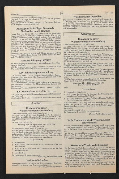 am 12.06.1994 wird für eine Wahlzeit von fünf Jahren der Ortsgemeinderat neu gewählt. Gleichzeitig findet an diesem Tag die Direktwahl der Ortsbürgermeister erstmals durch die Bürgerinnen und Bürger statt.