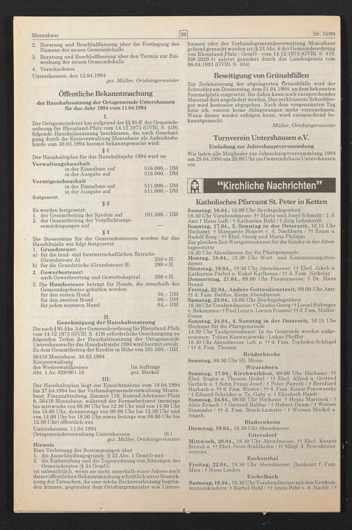 Der Ortsgemeinderat hat aufgrund der §§ 95 ff. der Gemeindeordnung für Rheinland-Pfalz vom 14.12.1973 (GVB1. S. 419), folgende Haushaltssatzung beschlossen, die nach Genehmigung durch die Kreisverwaltung Montabaur als Aufsichtsbehörde vom 30.03.1994 hiermit bekanntgemacht wird: