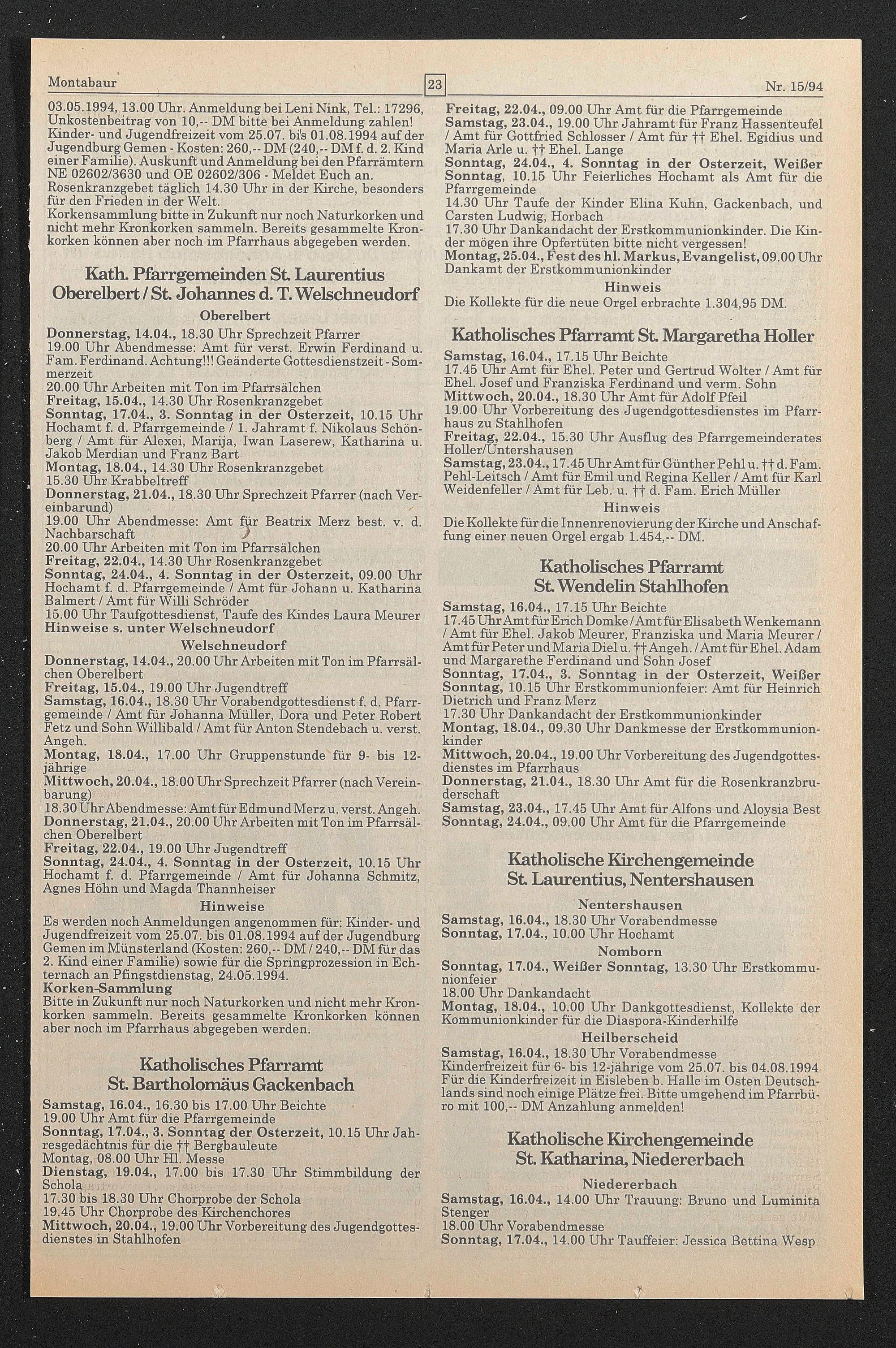 03.05.1994, 13.00 Uhr. Anmeldung bei Leni Nink, Tel.: 17296, Unkostenbeitrag von 10,-- DM bitte bei Anmeldung zahlen! Kinder- und Jugendfreizeit vom 25.07. bi's 01.08.1994 auf der Jugendburg Gemen - Kosten: 260,- DM (240,- DM f. d. 2. Kind einer Famihe). Auskunft und Anmeldung bei den Pfarrämtern NE 02602/3630 und OE 02602/306 - Meldet Euch an. Rosenkranzgebet täglich 14.30 Uhr in der Kirche, besonders für den Frieden in der Welt.