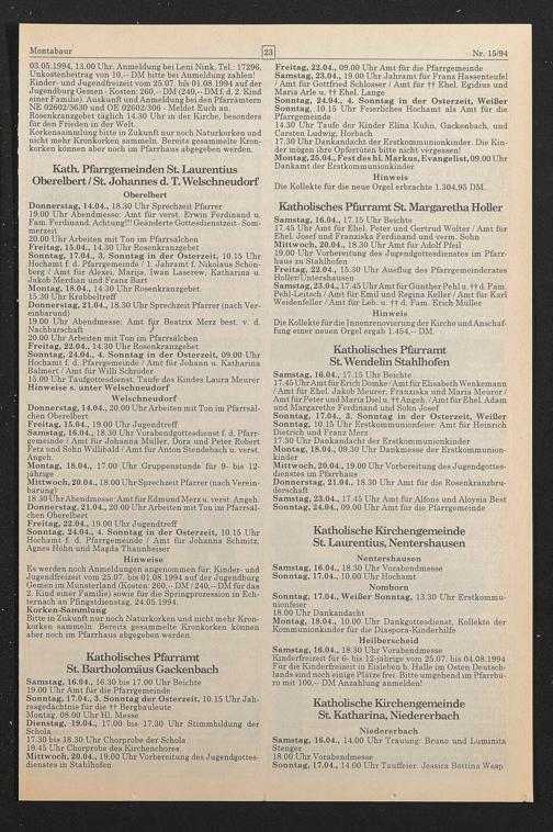 Samstag, 23.04., 17.45 Uhr Amtfür Günther Pehlu. tfd.Fam. Pehl-Leitsch / Amt für Emil und Regina Keller / Amt für Karl Weidenfeiler / Amt für Leb. u. ff d. Farn. Erich Müller