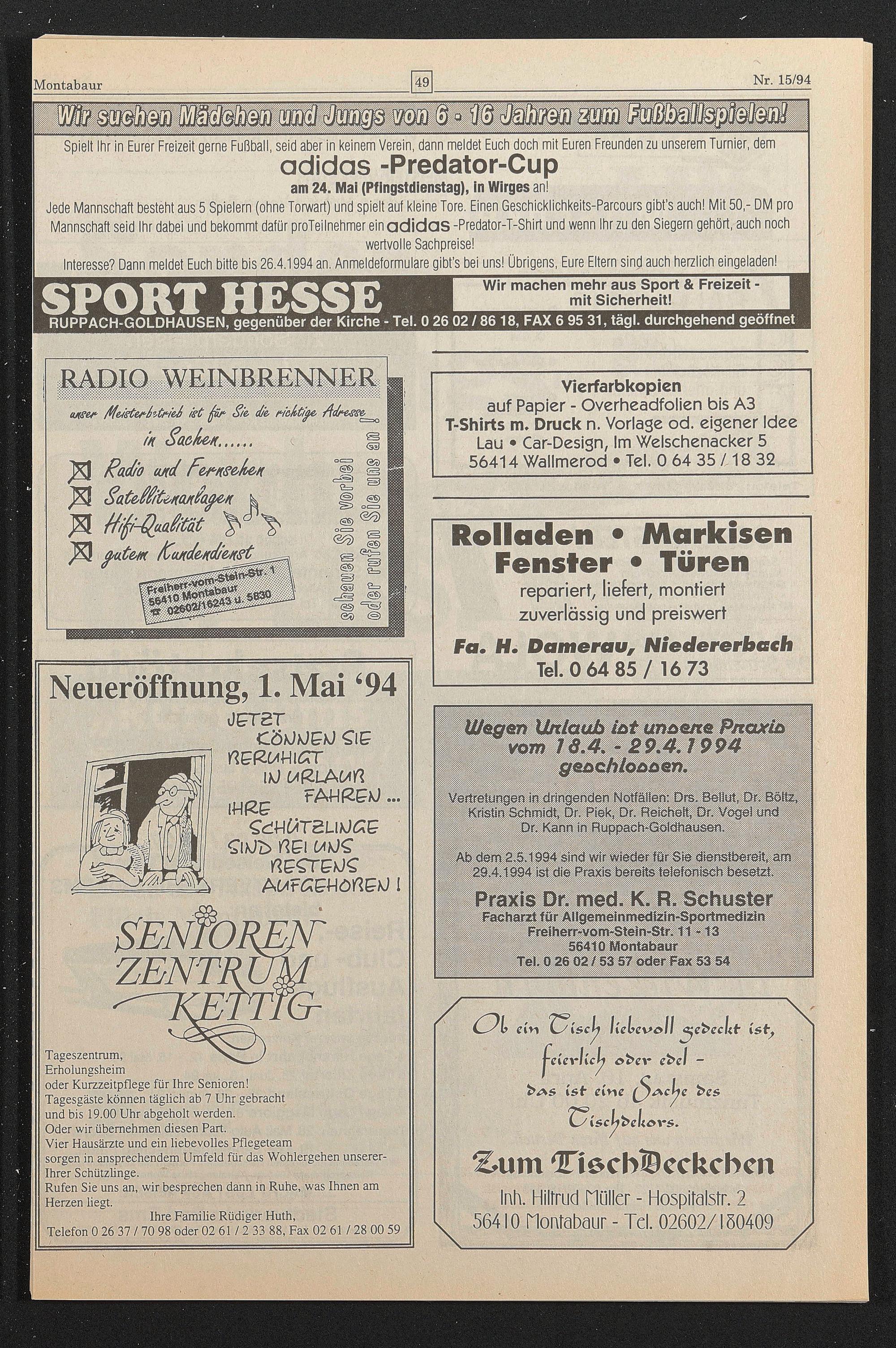 Ab dem 2.5.1994 sind wir wieder für Sie dienstbereit, am 29.4.1994 ist die Praxis bereits telefonisch besetzt.