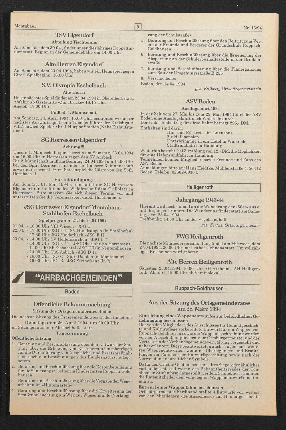 Die nächste Sitzung des Ortsgemeinderates Boden findet am Dienstag, dem 26. April 1994, um 20.00 Uhr