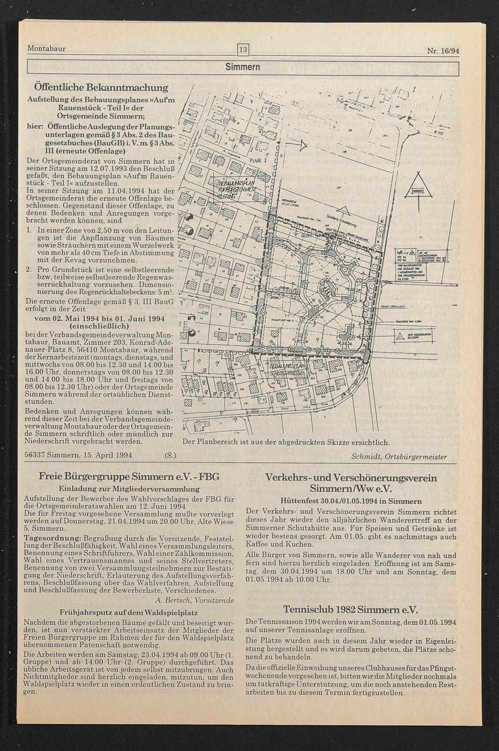 In seiner Sitzung am 11.04.1994 hat der Ortsgemeinderat die erneute Offenlage beschlossen. Gegenstand dieser Offenlage, zu denen Bedenken und Anregungen vorgebracht werden können, sind