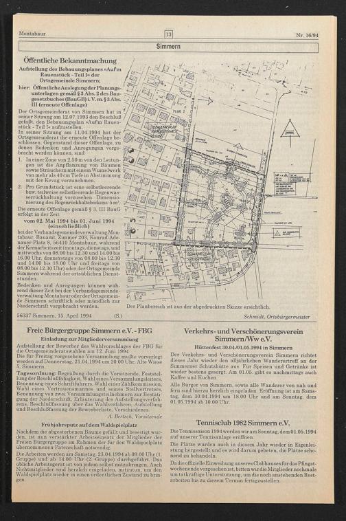 Bedenken und Anregungen können während dieser Zeit bei der Verbandsgemeindeverwaltung Montabaur oder der Ortsgemeinde Simmern schriftlich oder mündlich zur Niederschrift vorgebracht werden.