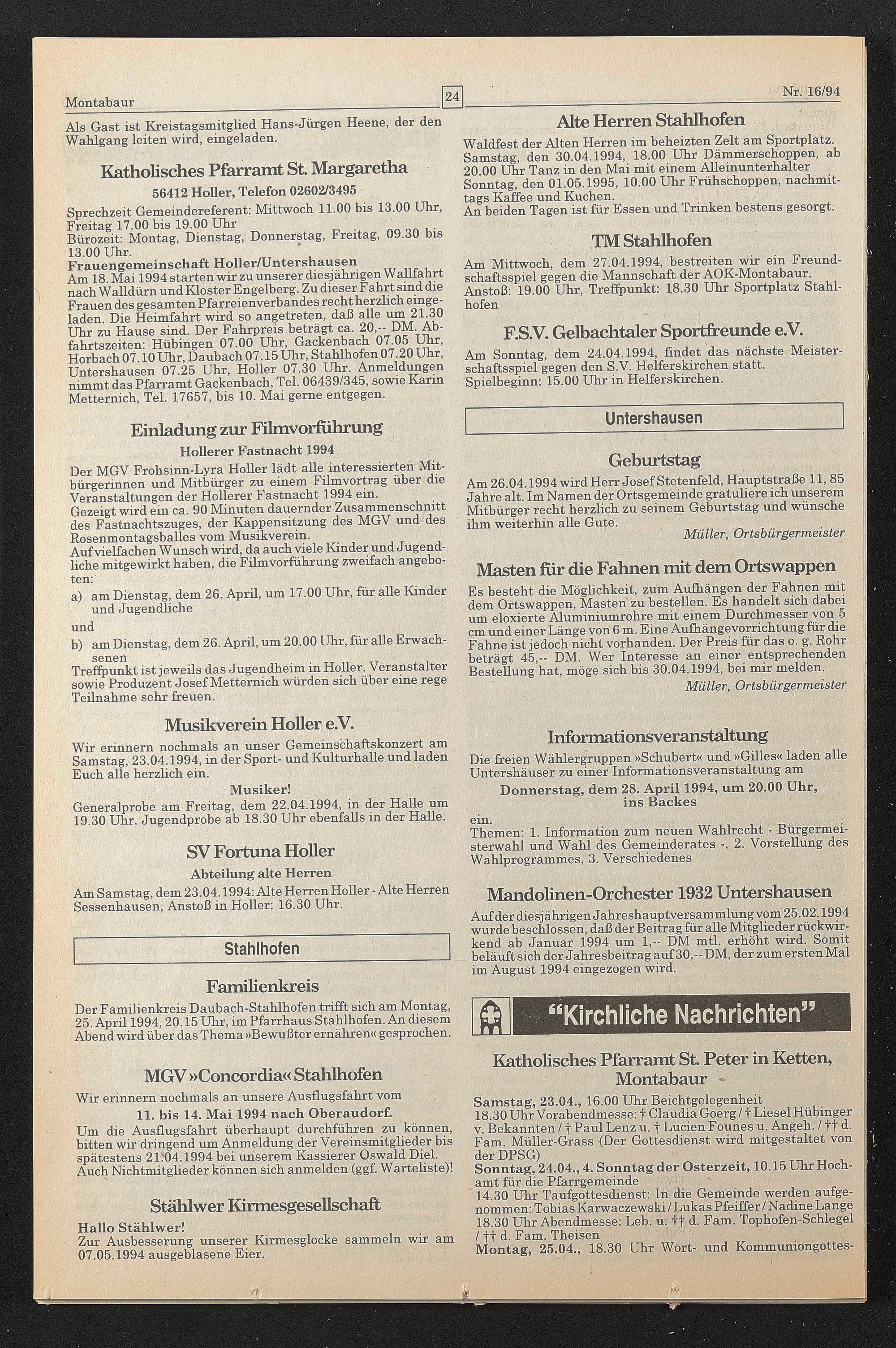 Am 26.04.1994 wird Herr Josef Stetenfeld, Hauptstraße 11, 85 Jahre alt. Im Namen der Ortsgemeinde gratuliere ich unserem Mitbürger recht herzlich zu seinem Geburtstag und wünsche ihm weiterhin alle Gute.